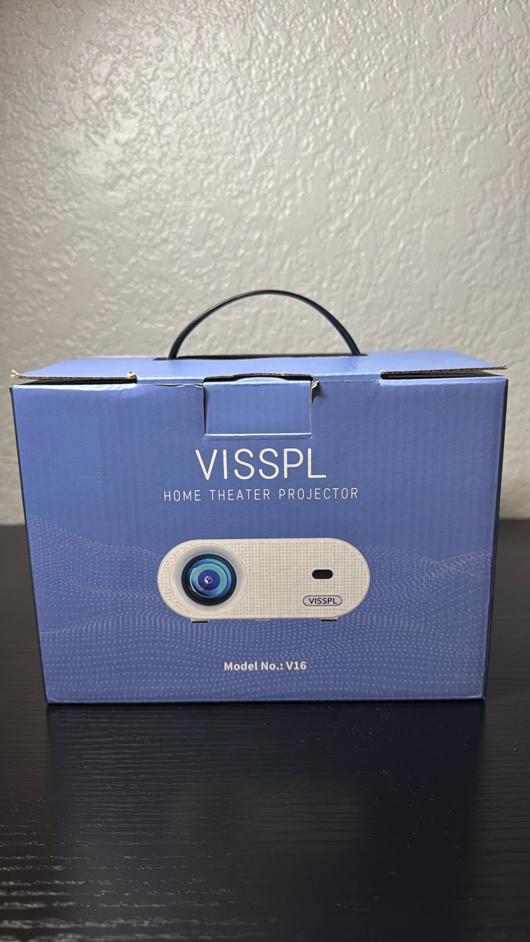 Brand new Visspl home theatre projector. 1080p mini projector that includes an HDMI cable, remote, and tripod.