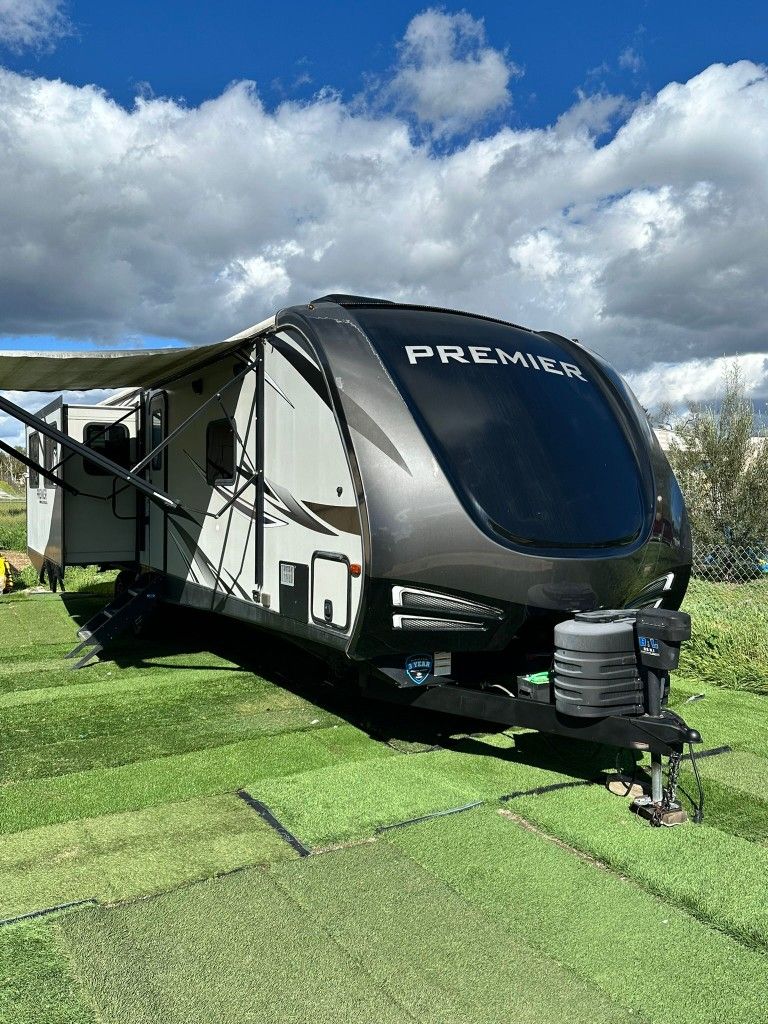 2019 Keystone Bullet Premier Model 34 riri 3 slide outs Length 38 ft 6' 11 ceilings Weight 7300 lbs Front master bedroom with queen bed and a walk in closet Bathroom has 2 entrys Kitchen has large pantry, 3 burner stovetop with oven, 8 cubic foot refrigerator, and a dinette that turns into a bed Living room has dual recliners, a trifold sofa that turns into a bed, and an entertainment center that has a new tv and Bluetooth speaker system There are 2 air conditioners, electric awning, electric tongue jack, electric stabilizing jacks, indoor/ outdoor speakers Clean title in hand No water damage No leaks Rv, travel trailer, camper, live in