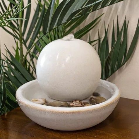 Sunnydaze Tabletop Ceramic Tabletop Fountain with Orb - Relaxing Indoor Fountain for Meditation - for Office, Bedroom, or Living Room . 9" H x 7" Diameter . Unit Comes New in Box. Assembly Required . Thanks and Enjoy .