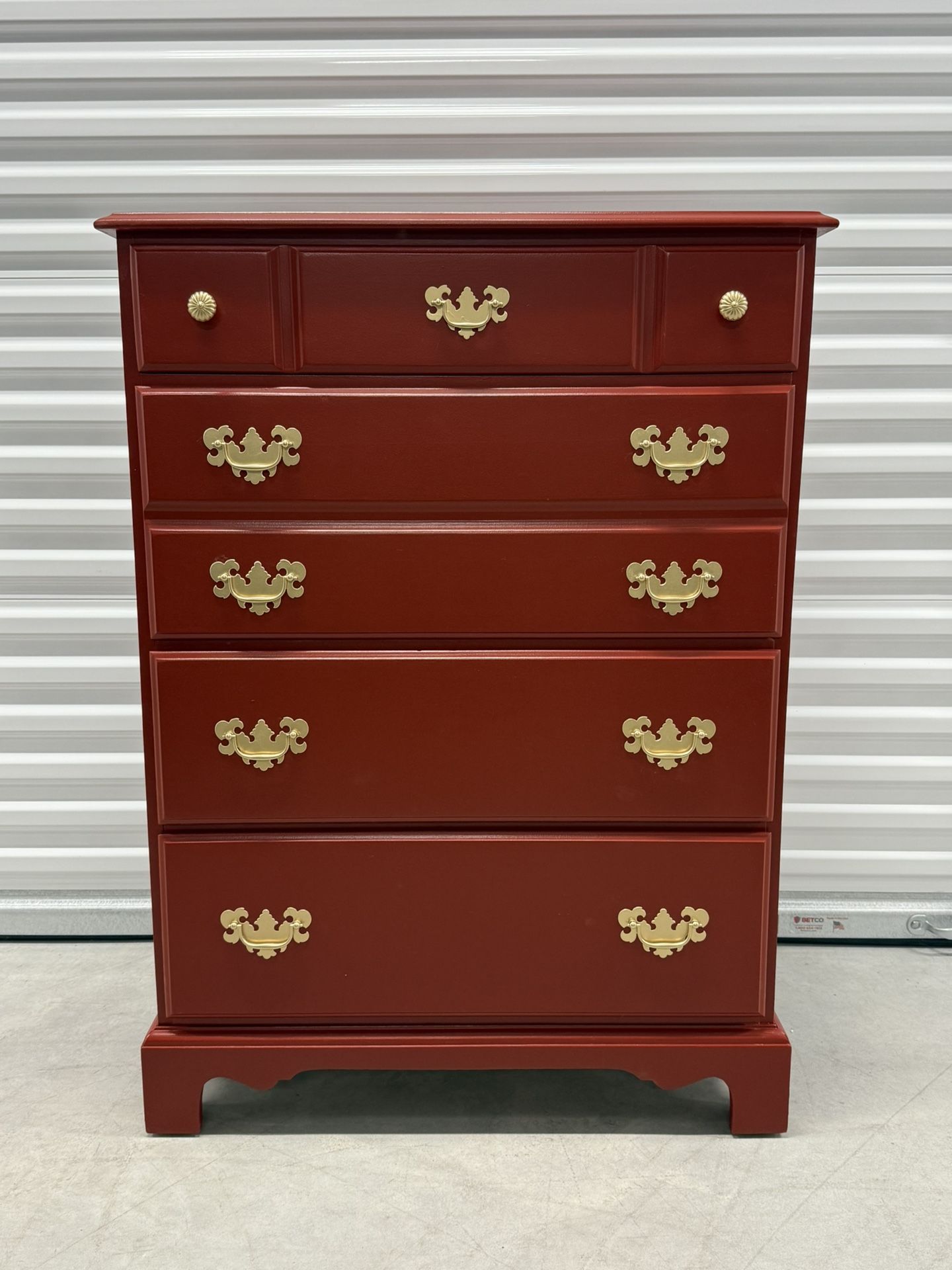 ♦️Red Pepper Solid Wood Dresser – 4 Drawers 🛻Free Delivery (depend on location) 💸 $ 120 (zelle or cash) 🪵 Solid Wood 🎨 Hand-painted in a deep Red Pepper with gold handles 🗄️ great storage for bedroom, hallway or entry ✨ Classic design with a unique stepped base 📏 Dimensions: H: 44 in W: 32 in D: 18 in 💬 Message now to claim it or ask questions! #solidwooddresser #highboydresser #nycfurniture #dresserforsale #homedecor