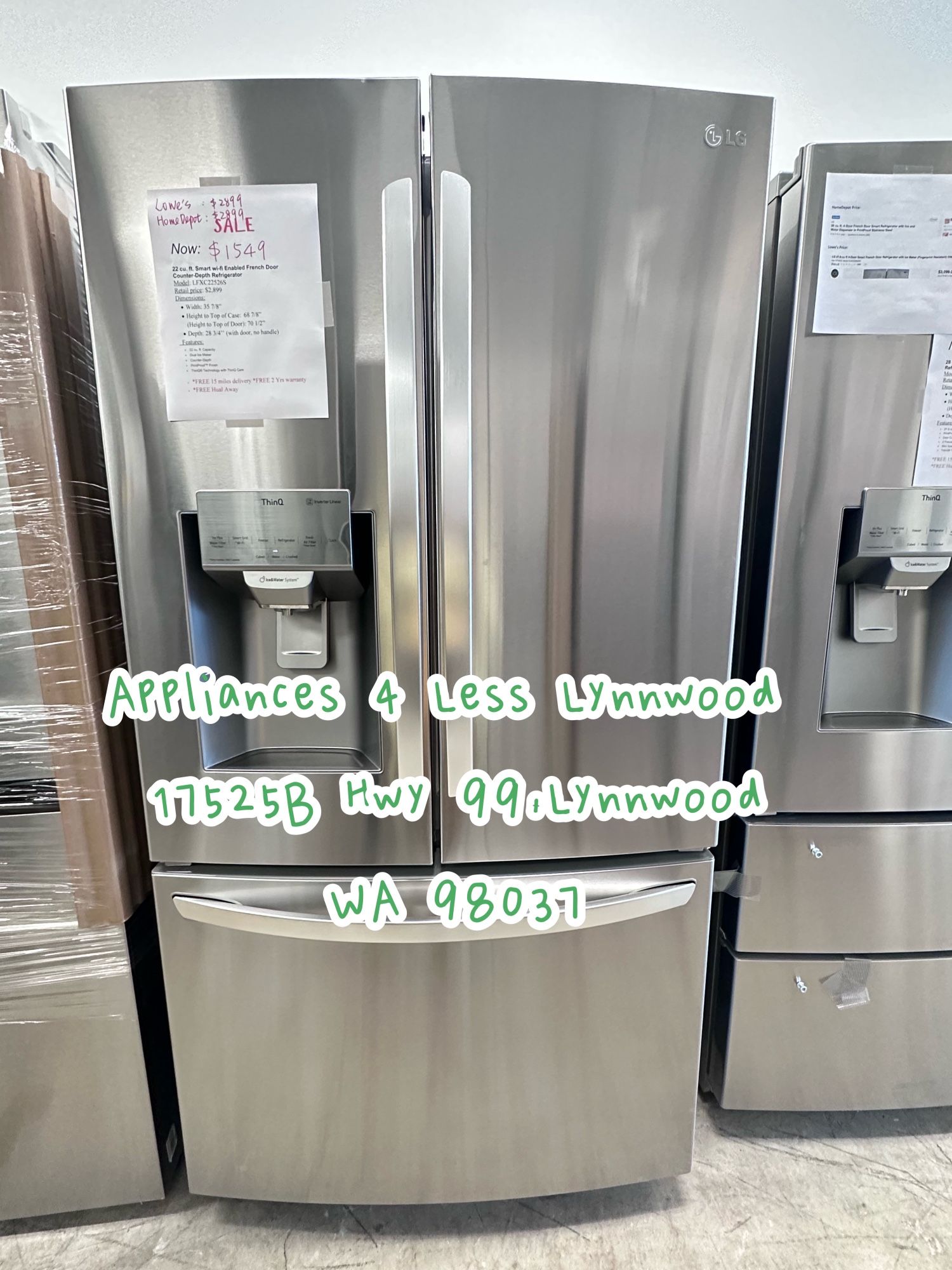 Appliances 4 Less Lynnwood Model: LFXC22526S MAP 2899 Others price: 2899 Our price 1549 (additional discount could apply) -Free delivery within 15 miles -Free 2 yrs warranty -Free hual away -Free install (call for more information) -Same day pick up -Financing available 17525B*Hwy99 Lynnwood*WA98037 Appliances 4 Less Lynnwood