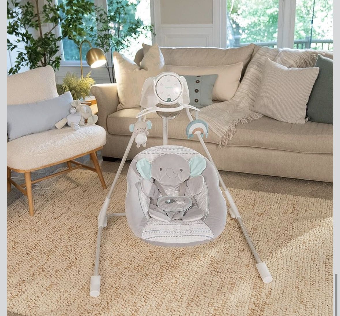 Gently used. Ingenuity InLighten 5-Speed Baby Swing - Swivel Infant Seat, 5 Point Safety Harness, Nature Sounds, Lights - Van Elephant. Originally $150. No stains.