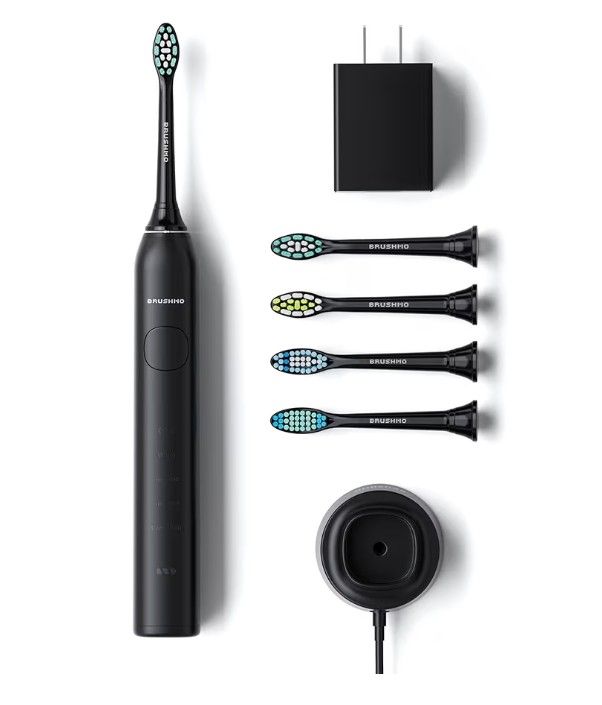 Brushmo Super Sonic Electric Toothbrush with 4 Replacement Heads - Rechargeable Electronic Tooth Brush for Adults with 5 Customizable Modes - IPX7 Waterproof & Long-Lasting Battery - Black NEW NEW NEW SEALED PACKAGING. A Cleaner Smile with Every Brush: Elevate your oral care routine with the Brushmo Super Sonic Toothbrush, delivering a next-level clean. Designed with 5 brushing modes and compatible with most click-on brush heads, it offers a truly personalized brushing experience. Color: Midnight Black. What’s Inside the Box: 1 rechargeable electric toothbrush handle, 4 click-on Brushmo brush heads (Plaque Control, Whitening, Gum Care Sensitive, and Total Clean), and a USB type-C charger with a power adapter. Upgrade to a Brighter Smile: Customize your brushing experience with five modes: Clean, White, Sensitive, Gum Care, and Deep Clean. With 33,600 brush strokes per minute and a built-in 2-minute timer, the Super Sonic Toothbrush effectively removes plaque and surface stains for a brighter smile. Designed for Endurance & Everyday Use: With IPX7 waterproofing, this toothbrush can withstand up to 1 meter of water for up to 30 minutes, so you can confidently use it in the shower or the bath. Plus, enjoy up to 30 days of brushing on a single charge. Highest Health & Safety Standards: Brushmo toothbrushes are crafted with premium DuPont filaments for safe, high-quality oral care. Tested for performance and safety, they meet OEHHA Prop 65 standards, ensuring top-tier hygiene and durability. Brush Better Worldwide: Founded in 2014, Brushmo is a leader in innovative oral care, combining dentist-designed technology with patented solutions across the U.S., Asia, and Europe. Dedicated to making quality dental care accessible, Brushmo’s products aim to help everyone—kids included—put their best tooth forward.