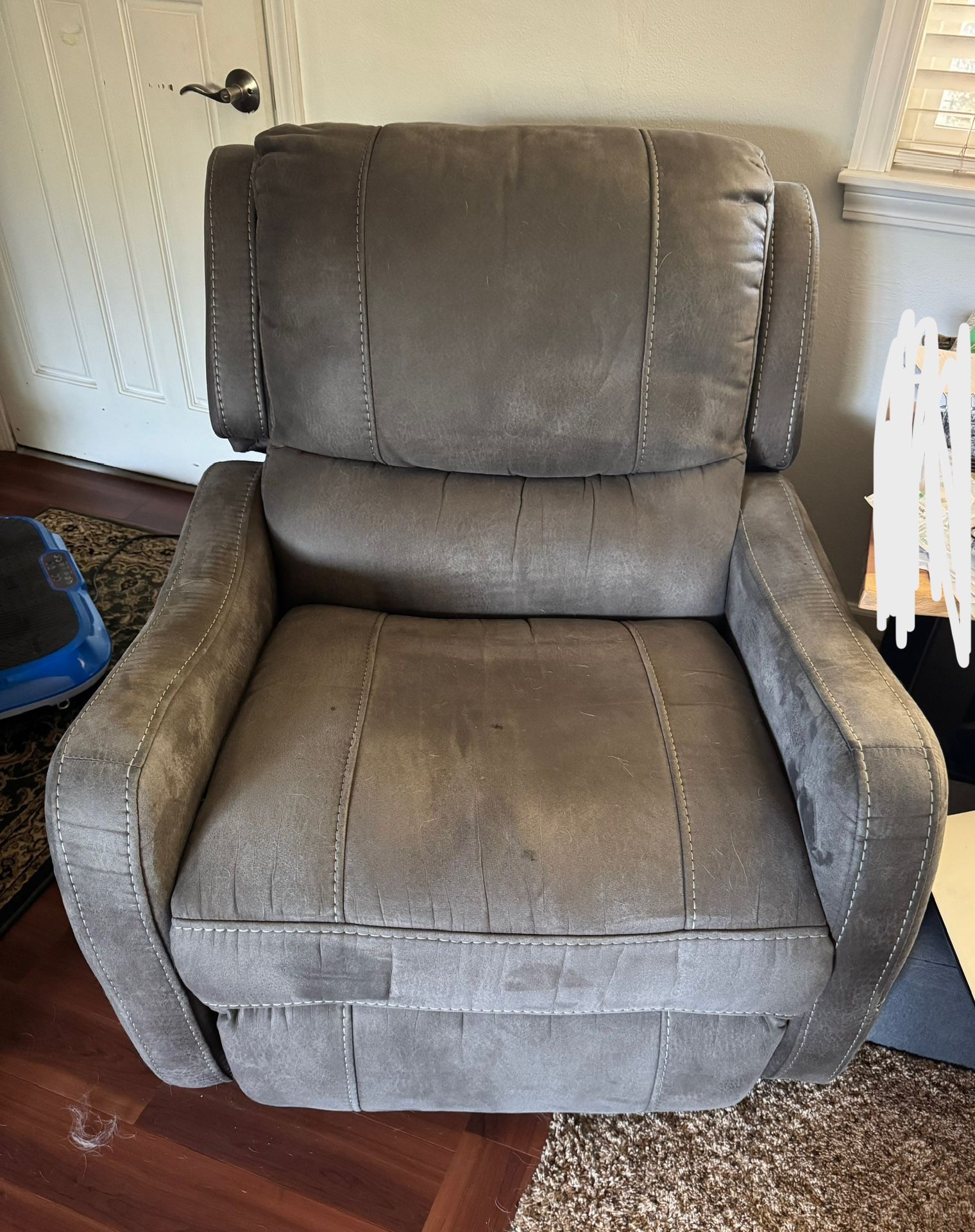 Used electric recline chair. Some minor use signs (creaky, small stain). It is a wall hugger model and fully reclined basically flat. A gray color with brown undertones. Smoke free home but home with pets. Will need 2 people to move it.
