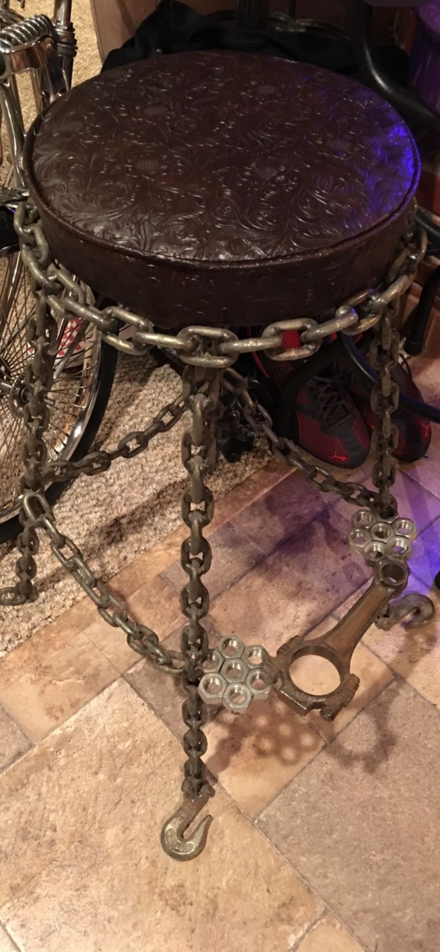 Welded chain links with a leather seat. I bought this custom made from a fabricator years ago. Really very cool with a connecting rod from a small block mopar engine. Heavy and sturdy!! I’m in Bolingbrook Illinois, asking $200 cash obo.