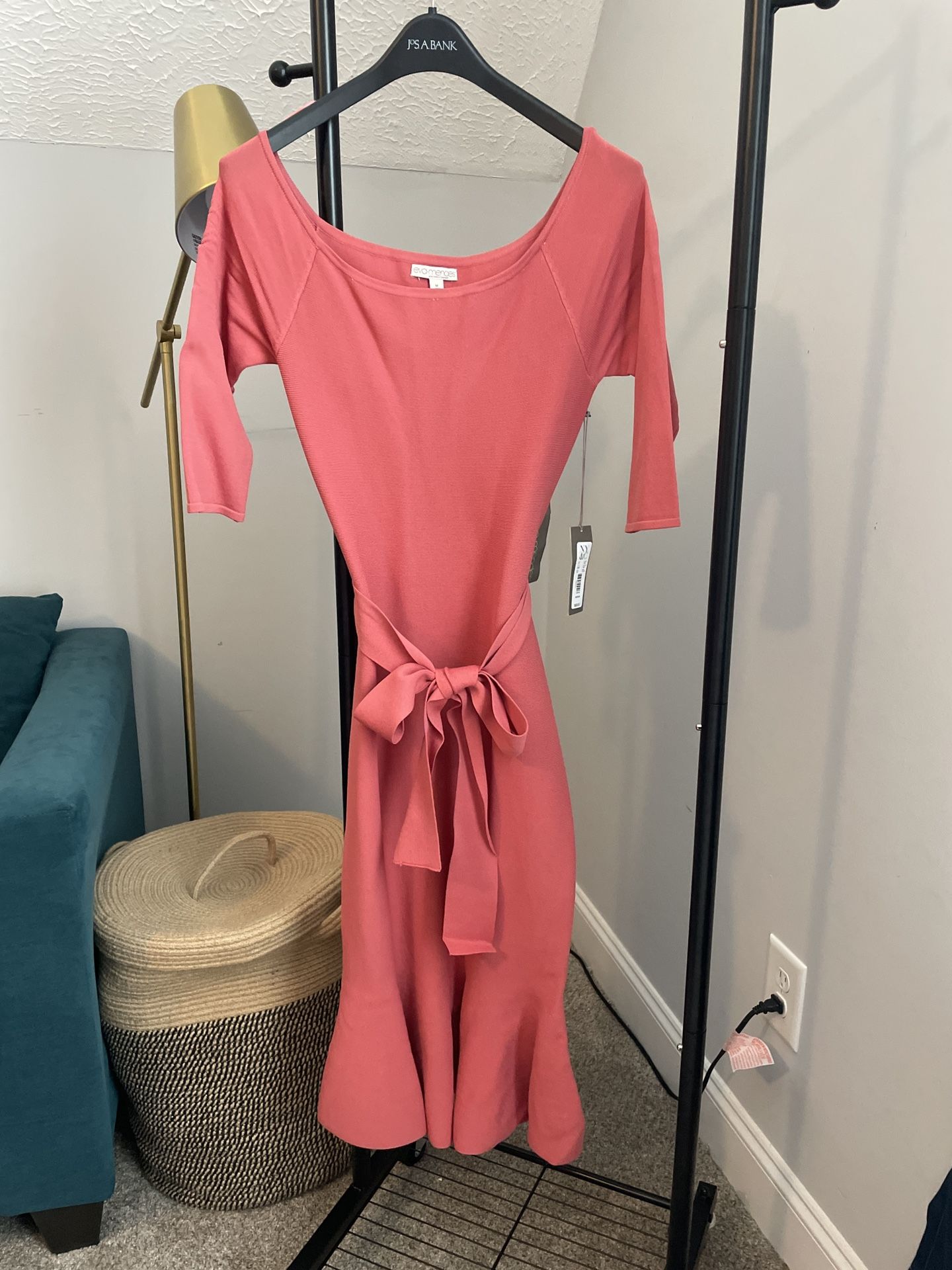 From her NY&C collection. Mid length color: Coral size:M Strechy material yet somehow comfortable and snug. Belt does detach fully if desired. Brand new never been worn with tags