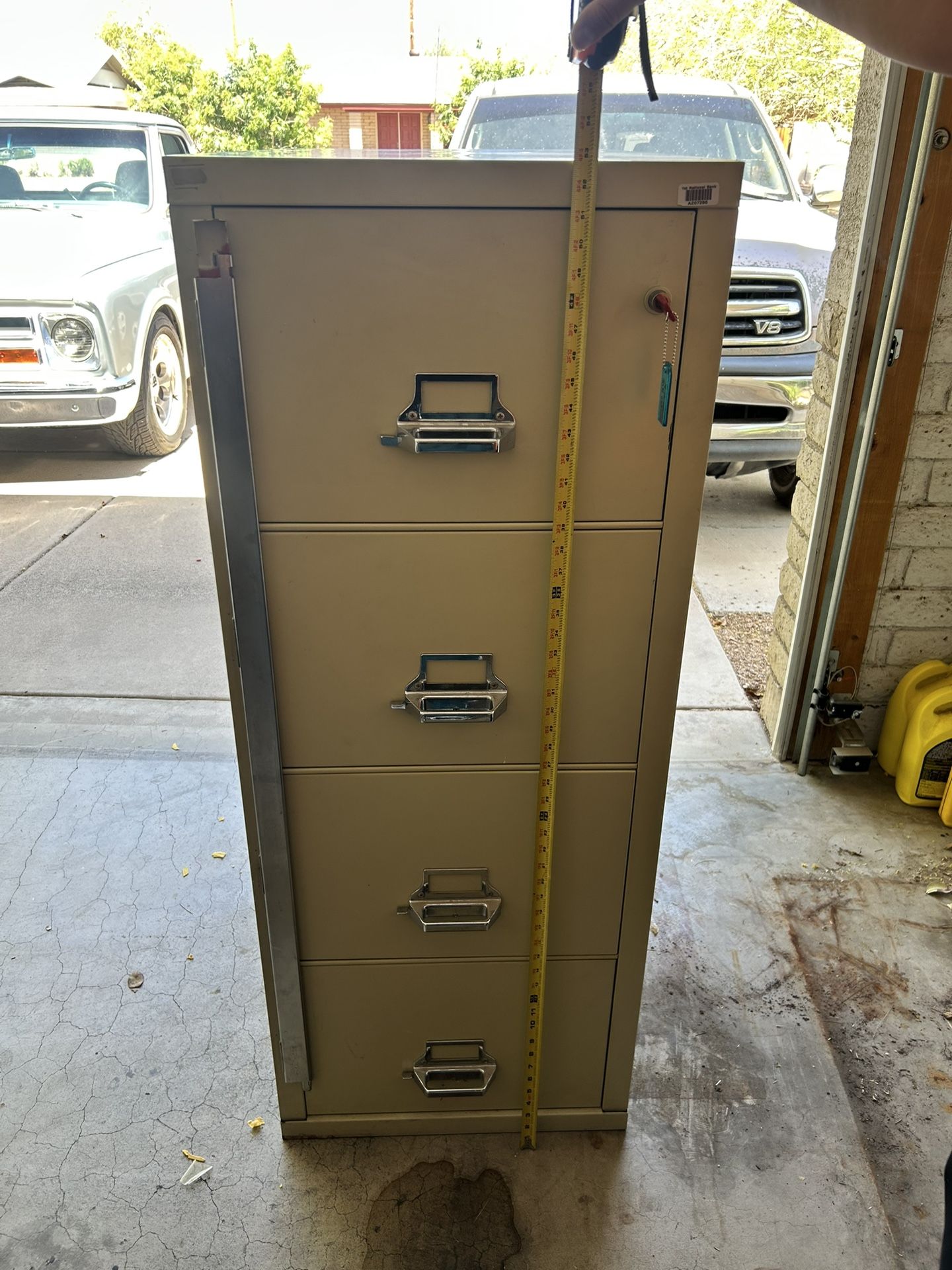 21 3/4 in x 52 3/4 in Fireproof Around 500 lbs All drawers pull to the same level 9 spare keys Great condition for it being 15 years old. obo