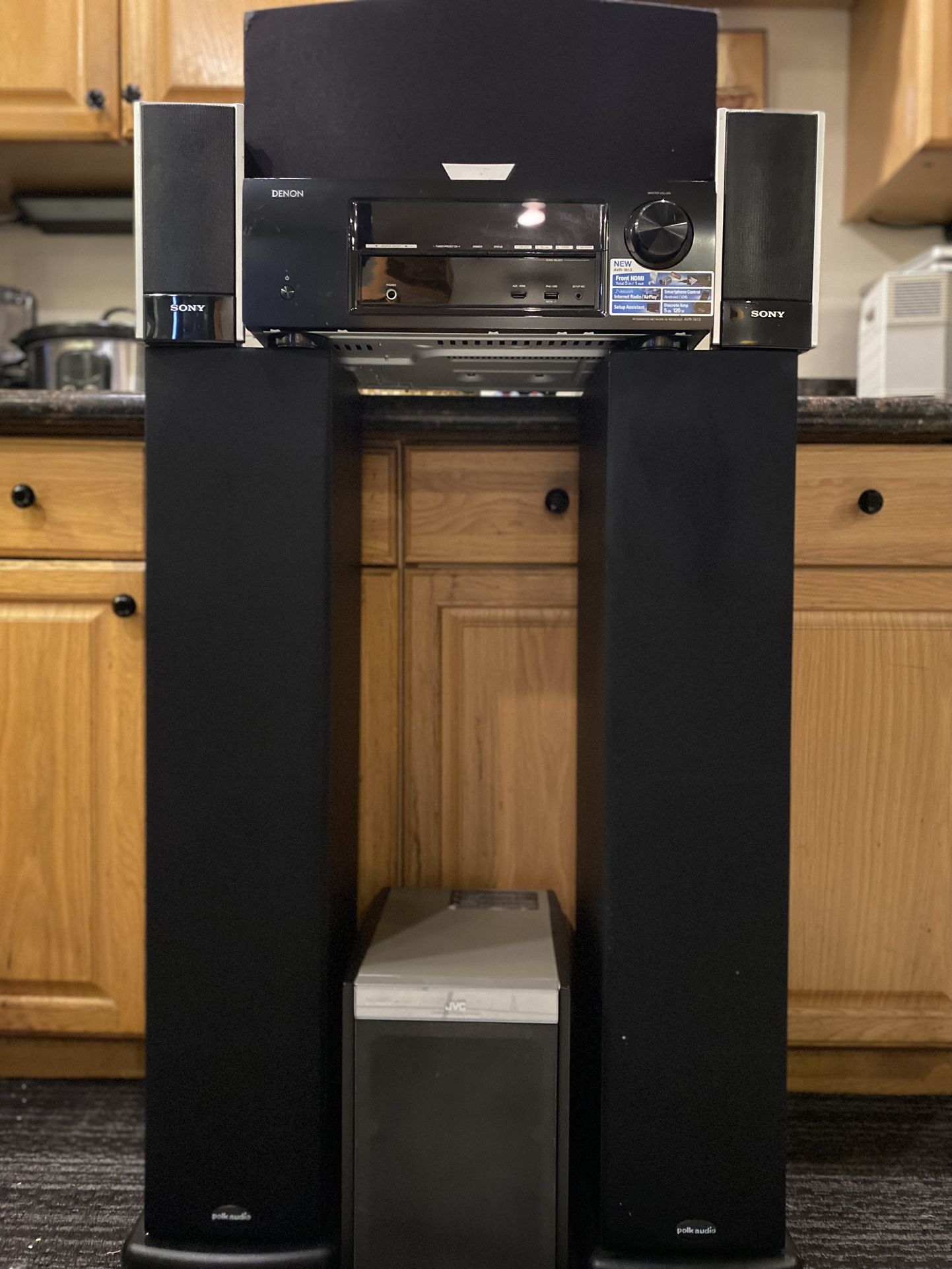 HDMi , USB, Bluetooth, 3D sound with 5.1 channels Great sound quality and comes with two Polk audio towers plus a center and rear speakers A powered bass subwoofer is also included to enhance the show HDMI cables and Denon remote Everything in very good condition All for $250 Pioneer, Yamaha, Sony, Kenwood, Harman kardon, Klipsch, Mirantz