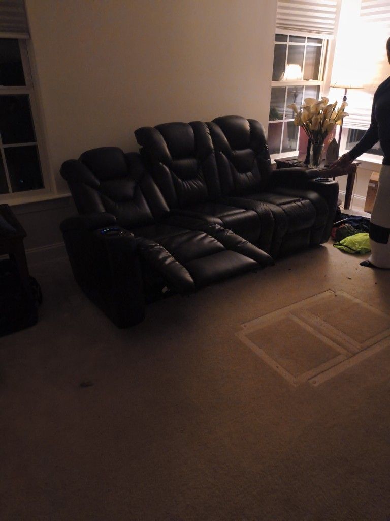 Black reclining sofa with head rest that lift and hot and cold arm ret ,peeling in a few spots