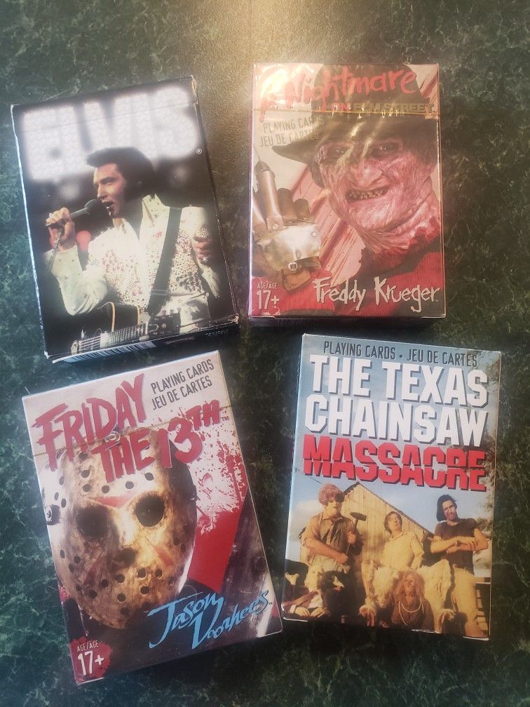 1 pack of Texas chainsaw massacre, 1 pack of Friday the 13th, 1 pack of Elvis, and 1 pack of a nightmare on elm street. These are complete sets of playing cards and are new. They come from a smoke and pet free home.