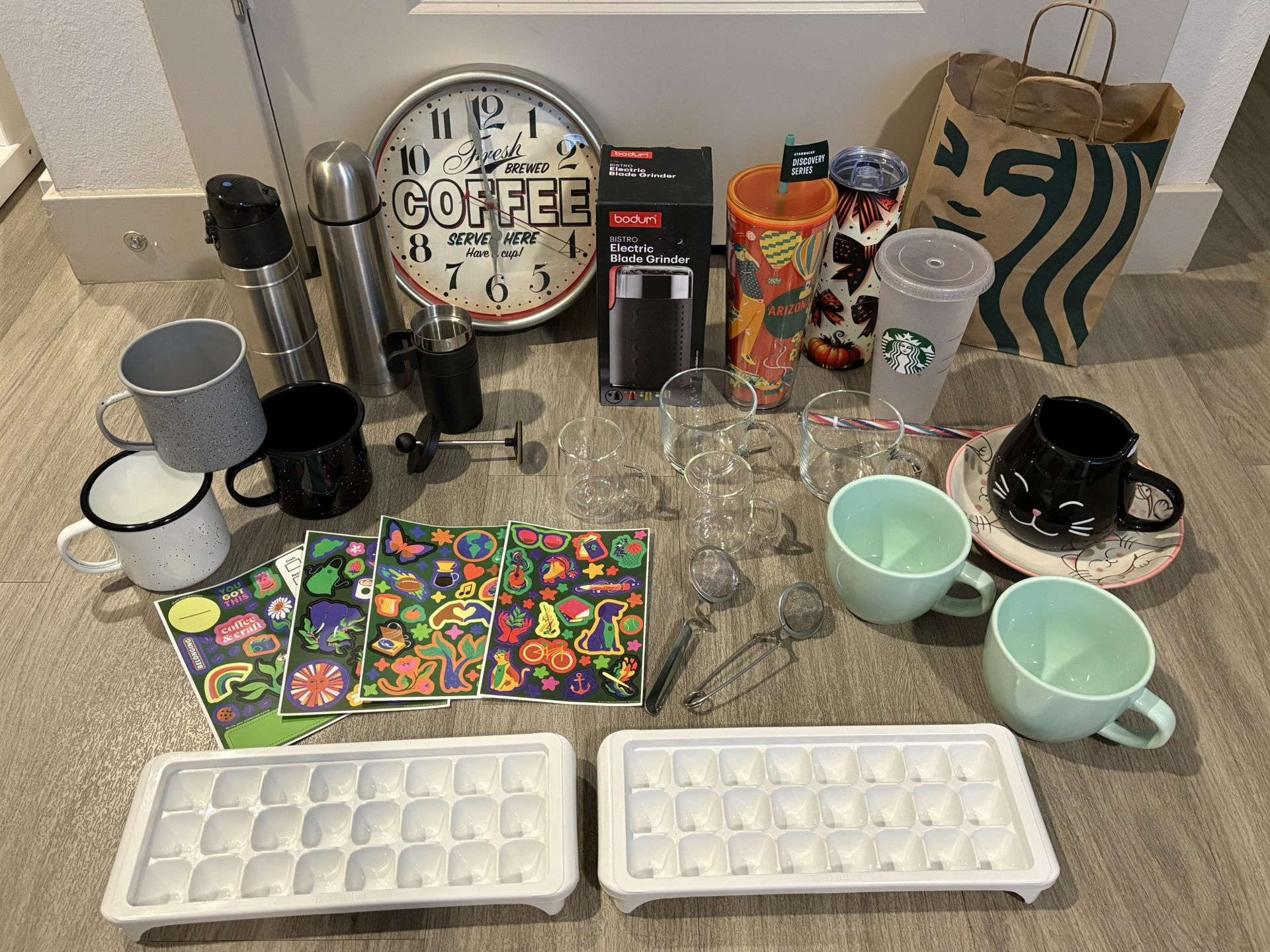 Coffee/Tea (2) Thermos, Electric Grinder (Bodum), Kitchen Rug 4ft. Long, Tea Strainer Mesh Tea Ball with Squeeze Handles (2), Ice Cube Trays (2), Coffee/Tea Mugs: 3 Tin, 4 Glass, 3 Ceramic, 1 Plate, Starbucks Golf Cup 24oz Envelope of Stickers, Starbucks Vacuum Insulated Tumbler New 20oz, Starbucks Reusable Sparkle Cup 24oz, Coffee Wall Clock (not battery included), Mug Press Bodum, Coffee Rug Long. Not Sold Separately. Cash Only $50