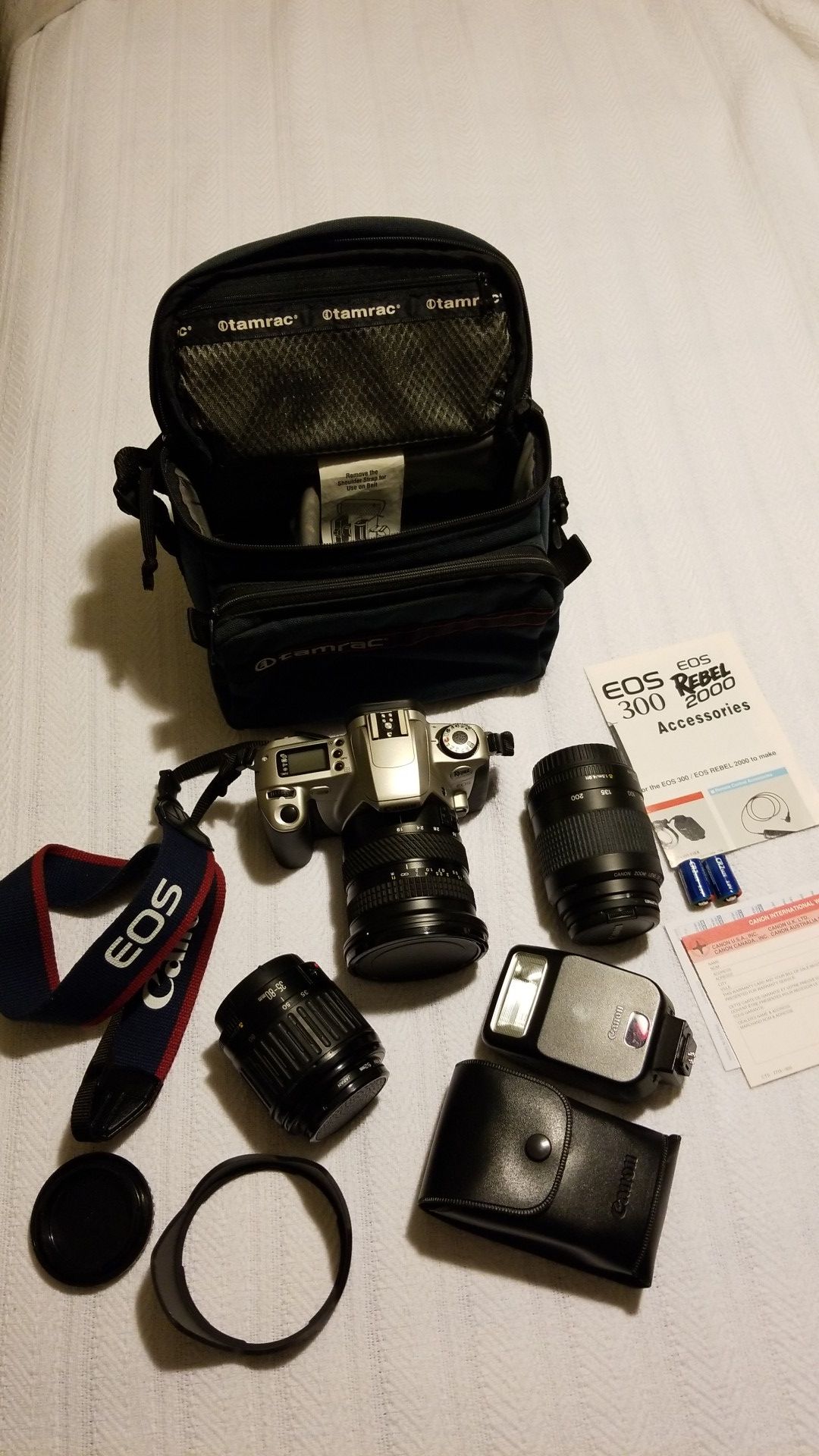 Rebel 2000, speed lite 200E enfrared flash, 3 lenses 19-35mm, 35-80mm and 80-200 zoom. All with uv covers. Tamrac bag included.