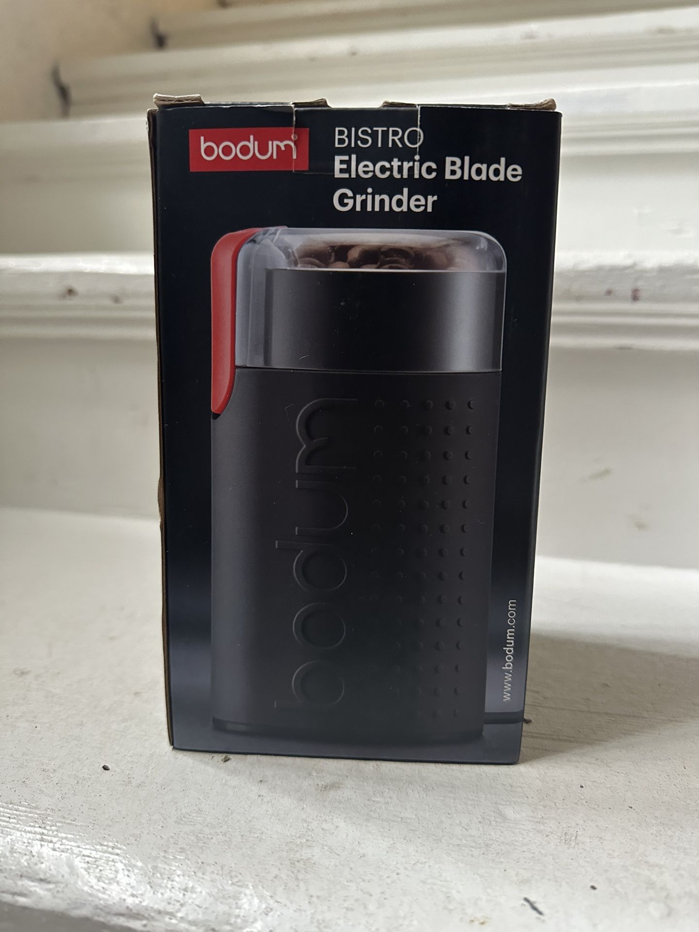 New in box! COFFEE GRINDER: BISTRO Blade coffee grinders take whole coffee beans from coarse to fine quickly and efficiently; fresh brewing from the comfort of your home BLADE & MOTOR: The blade grinder has a strong, durable stainless steel cutting blade that spins at a precise RPM, plus a powerful 150W motor SLEEK DESIGN: Push-button control allows for pulse action or continuous grind, and transparent lid allows the fineness grade to be observed to ensure coffee is made to your liking. COMPACT: Small coffee grinder has convenient cord storage in the base of grinder, perfect if you plan to leave out on the kitchen counter SERVINGS: This powerful coffee grinder makes enough coffee needed for brewing 8 cups of French press; pair with Bodum coffee maker