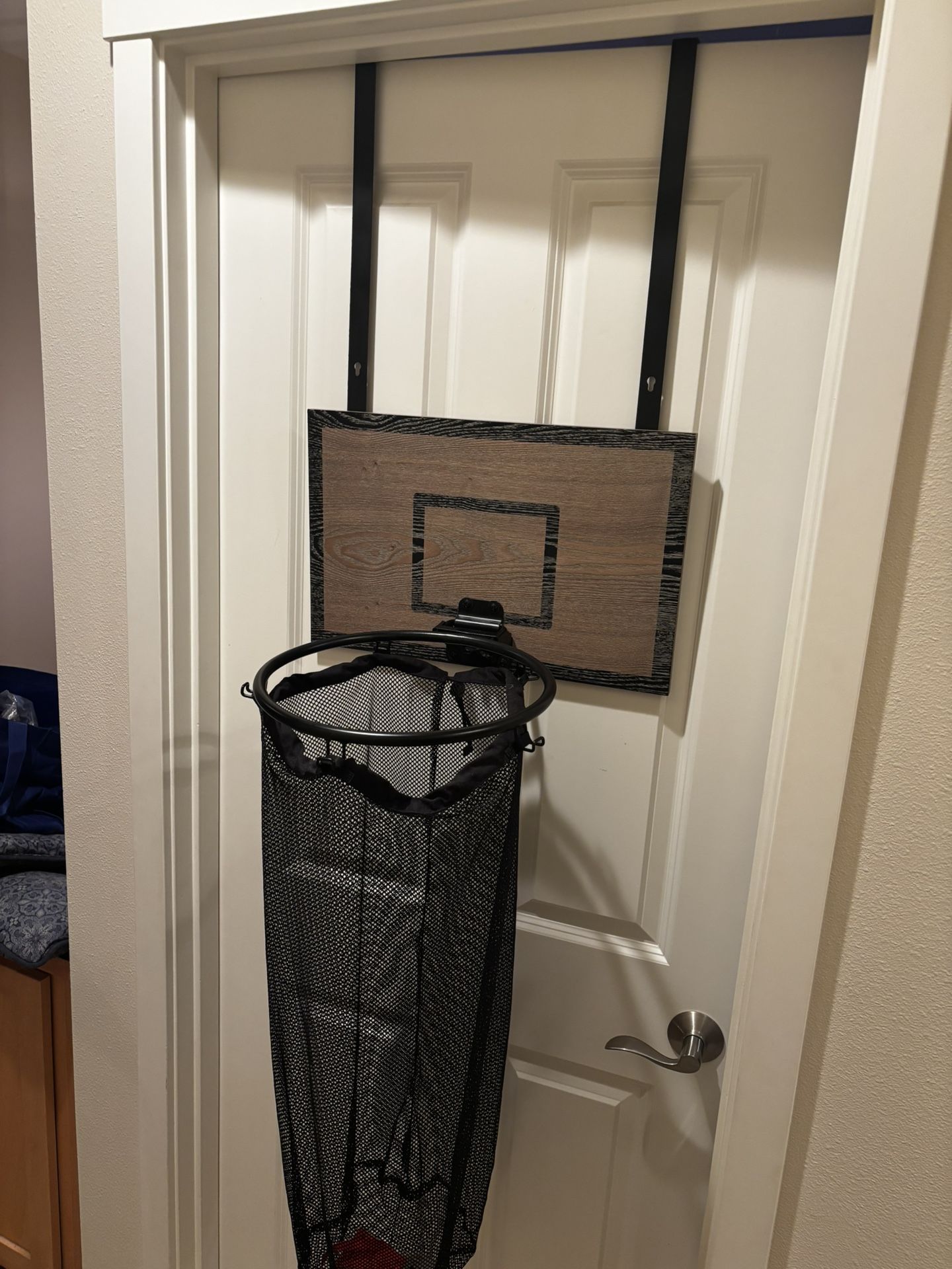 Dunk your dirty clothes into this sporty take on a classic laundry hamper. With the option to hang over your door or mount to your wall, you can shoot buckets from your bed. The black mesh laundry bag can be removed from its sturdy MDF backboard so you can tote it to the laundry room and back. Plus, the hoop on this laundry day game-changer flips up for extra space. DETAILS YOU'LL APPRECIATE Make your laundry an easy free throw with this basketball hamper. The basket hangs low from the door so everyone can reach it, rim folds up when not in use or when door is open. Made of MDF, (medium density fiberboard) metal, polyester and plastic. $100 new