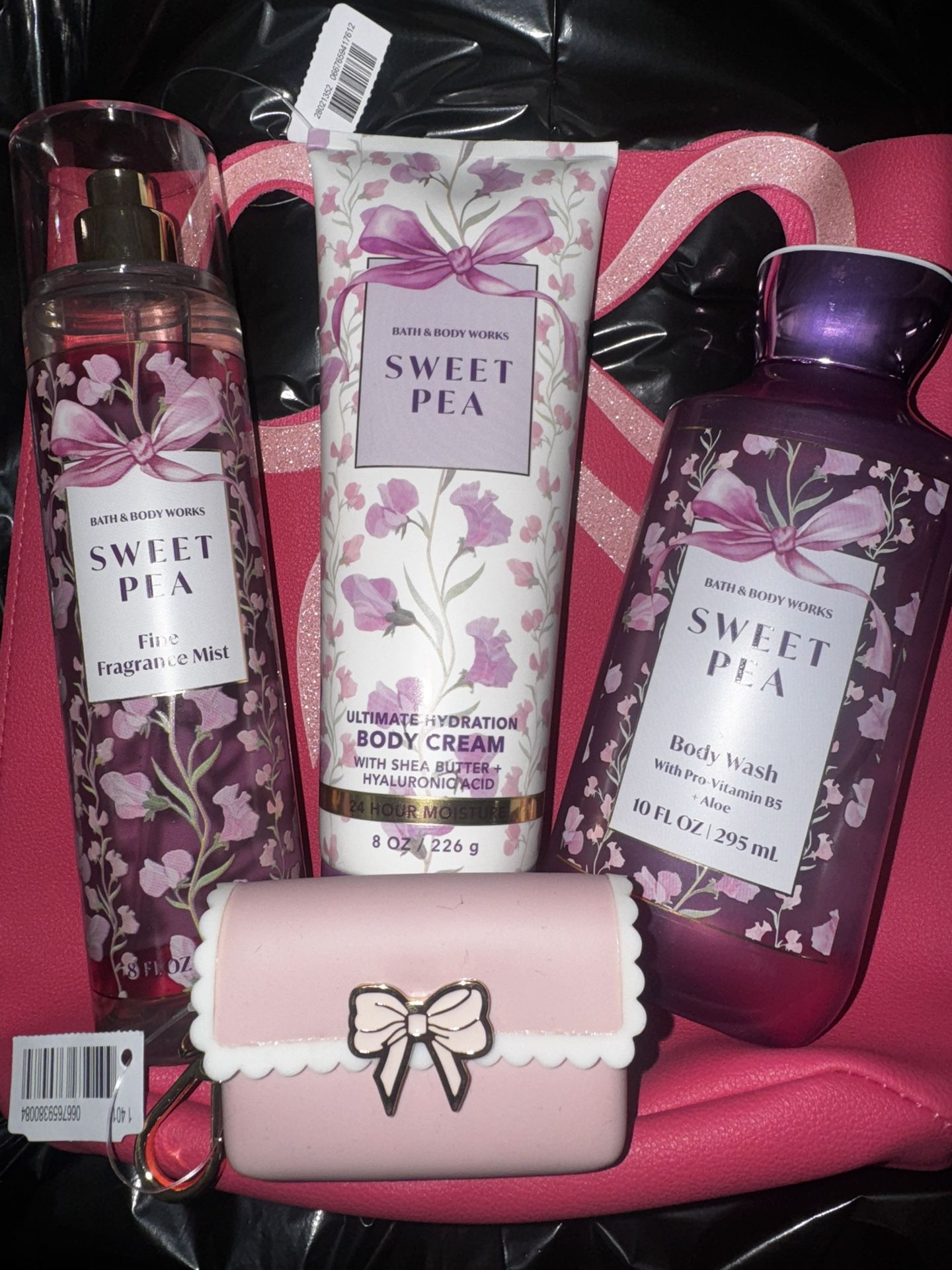 Sweet Pea fine fragrance mist, body cream, body wash, Pocketbac, Pocketbac holder & gift bag $30