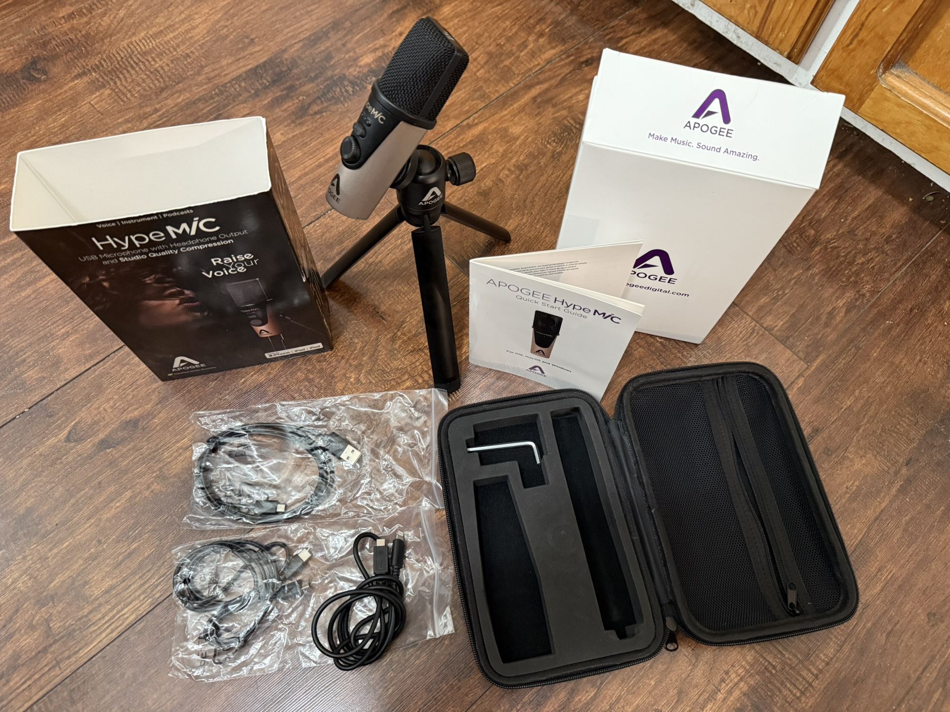 HypeMic USB CARDIOID MICROPHONE Input Type: Micro USB Connections: Lightning, USB (Type-C), USB (Type-A) Length: 4.88” (124 mm) Width: 1.5” (38 mm) Depth: 1.5” (38 mm) Weight: 0.45 lbs (0.20 kg) A/D Conversion and Mic Preamp Max SPL: 130dB (1% THD at 1kHz) Sensitivity: -36 dBfs (94 dB SPL. 1 kHz) Noise level: -108dBfs (A) at 0 dB gain Max gain of preamp: 46 dB Studio-quality analog compressor with three easy presets Professional cardioid condenser microphone capsule PureDIGITAL connection for pristine sound quality up to 24-bit/96kHz 46dB of mic preamp gain, digital controlled for greater precision Powerful headphone output with Blend feature for zero-latency recording Premium accessories kit includes tripod, pop filter, and travel case No configuration required, just plug in and use with any audio app Works with iPhone, iPad, Mac, and PC Apogee HypeMiC Microphone Lightning cable for iOS devices USB-C cable USB-A cable Premium desktop tripod stand Microphone stand adapter Travel case Slight scuff mark shown in picture. No pop filter, really didn’t need one.