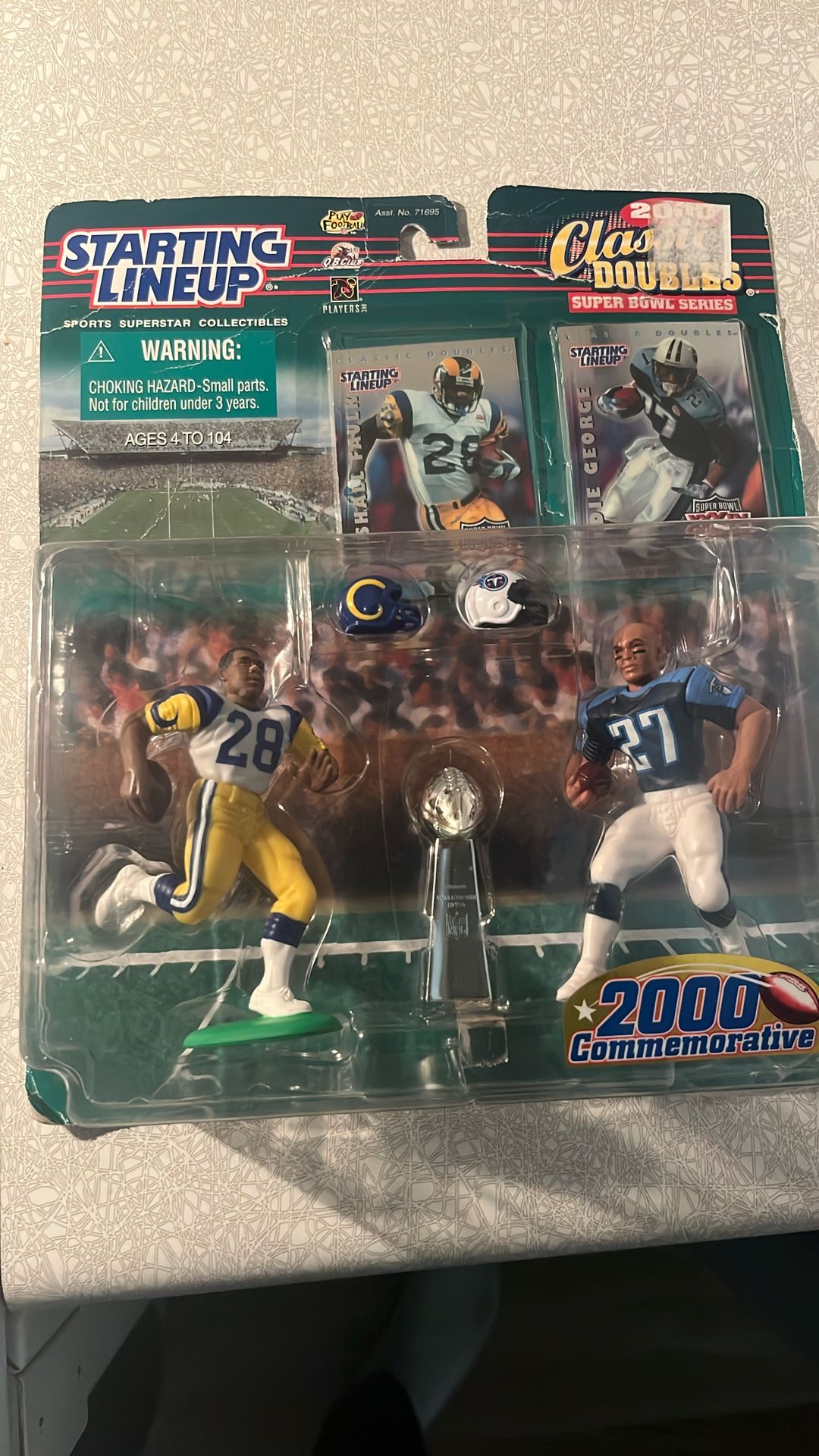 This product is a "Starting Lineup 2000 Classic Doubles" action figure set featuring NFL players Marshall Faulk and Eddie George. This commemorative set was released for the Super Bowl.