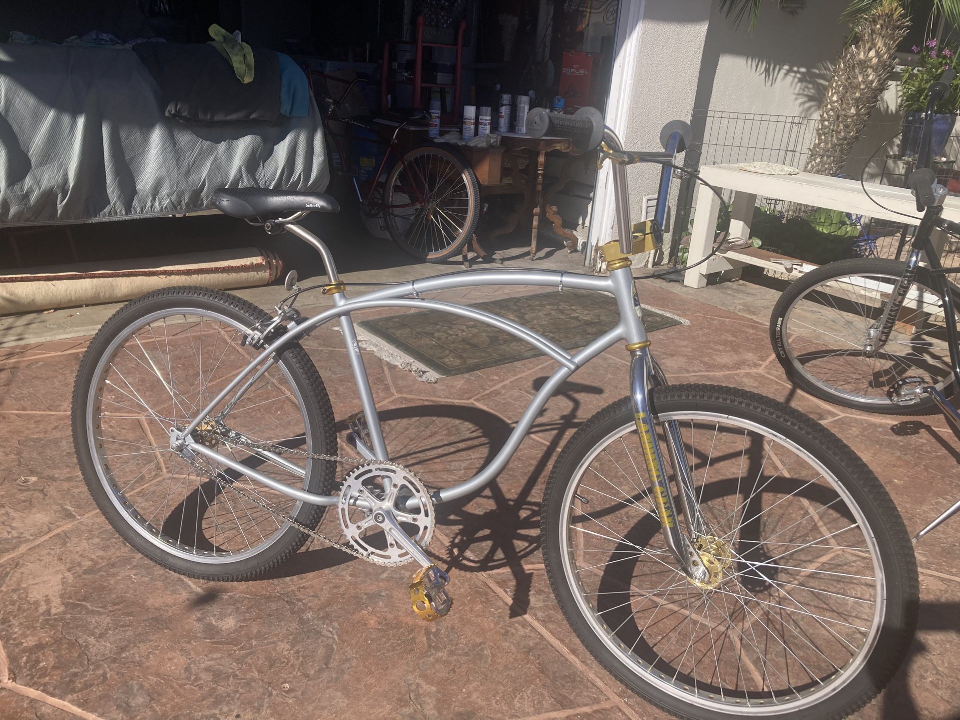 Silver powder coat. Schwinn Le Tour 3 piece cranks. Landing gear forks and Pro class rims. Beautiful bike. Must see.