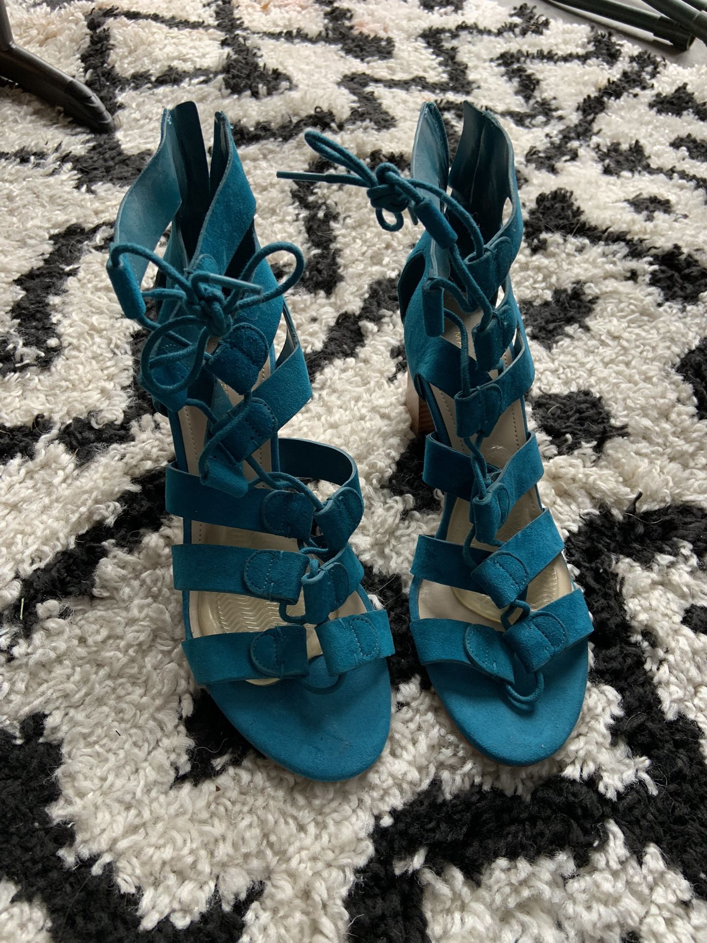 Marc Fisher Suede Lace-Up Block Heel Sandals - Paradox, Size 8 1/2 W, Teal. Used-like new. Smoke free home.