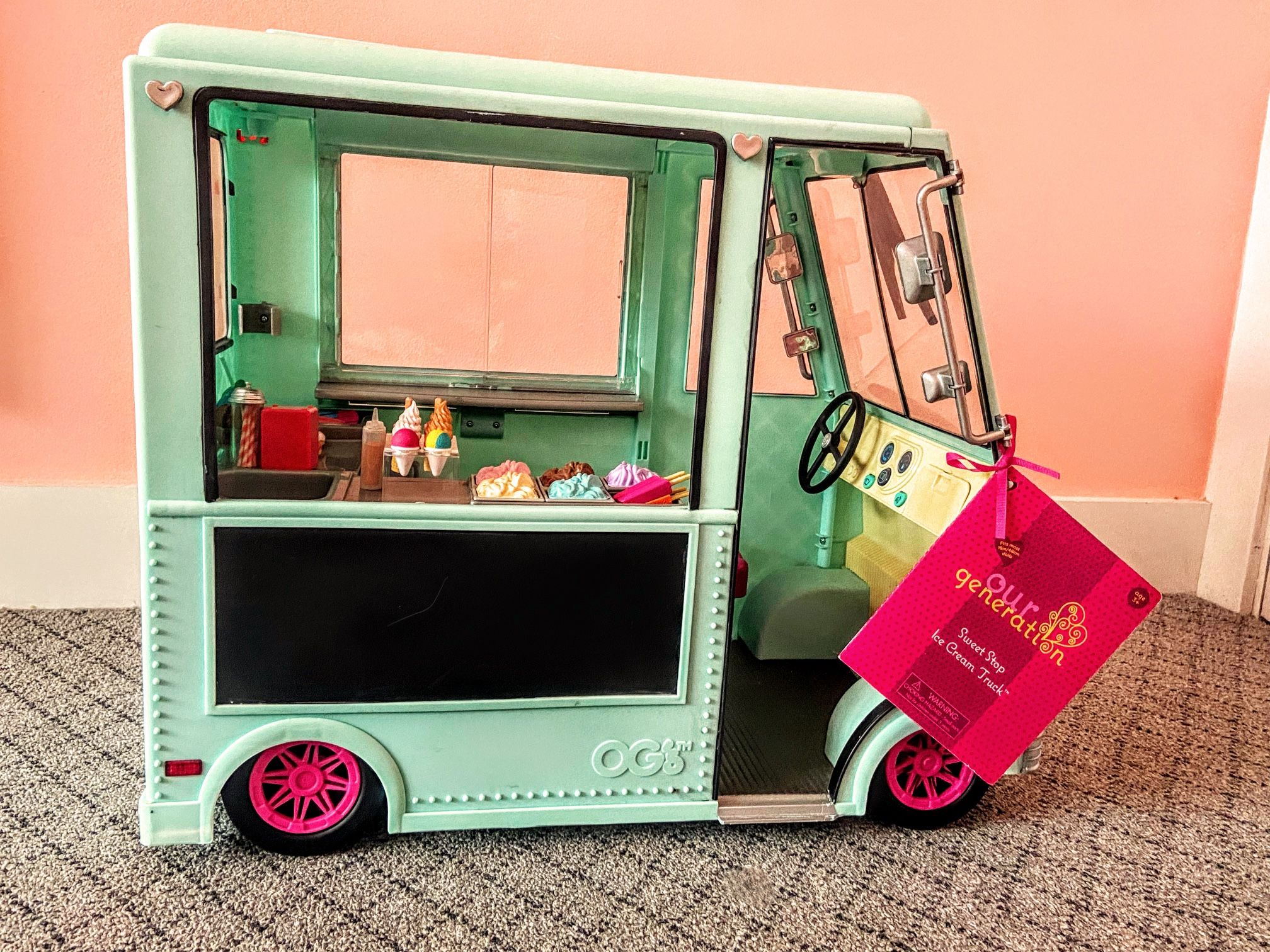 american girl ice cream truck good condition (some pieces may be missing)- lights, chalk board, and sounds works perfectly. everything in the photos are included including pieces. 19 inches length by 23 inches width