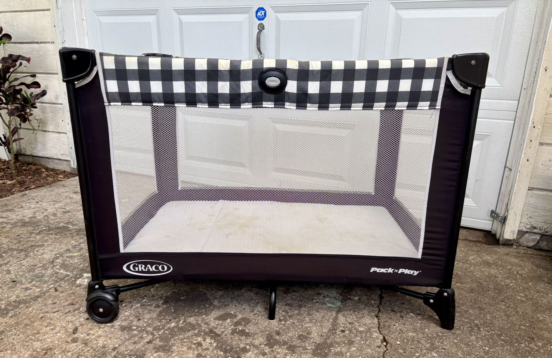 Perfect working condition, it could use a simple cleaning to remove stains from normal usage. - Folding feet and wheels allow for a 20% more compact fold than the average playard, making it easy to store and to carry - Convenient carrying bag for no-fuss travel and storage - Signature Graco push-button fold makes folding your playard quick and hassle-free - Handy wheels add convenience as the playard can be easily positioned anywhere - Durable frame increases longevity and makes this playard ideal for travel - Airy mesh on all sides provides maximum ventilation and allows little one to see all the action