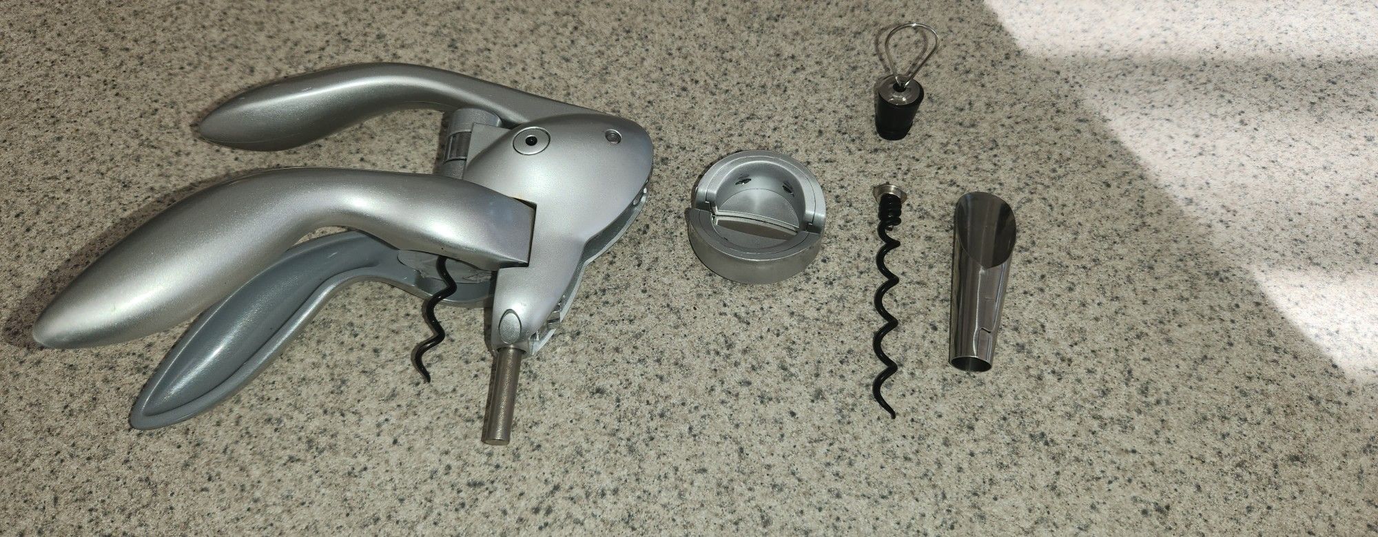 This corkscrew opens a bottle of wine in three seconds. This set includes a corkscrew, foil cutter, wine/champagne sealer, and spare spiral.