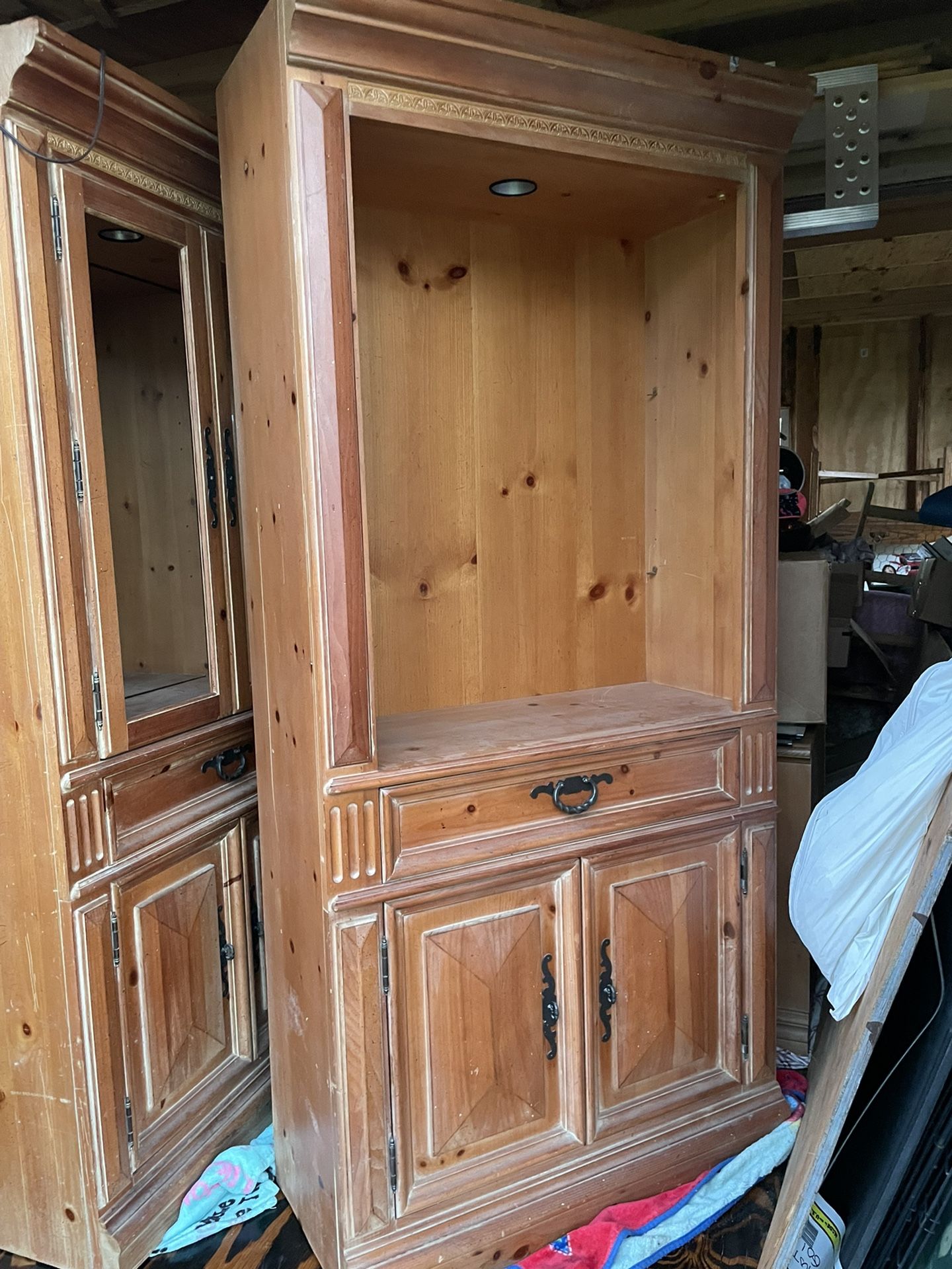 I have a three piece thomasville cabinet set. It don’t show in the pics but they both have glass shelves that go in them, lights in the top of both and they have china grooves in each shelf. I’m selling them as is for $350 cuz the one with doors on it is missing the piece of glass that goes in the one door which is $37 to fix at the glass factory in my town. I’m planning on one day refinishing all the pieces and when I do the price will go up a lot. These three pieces are new for $750,$950, and $225. Cash only.
