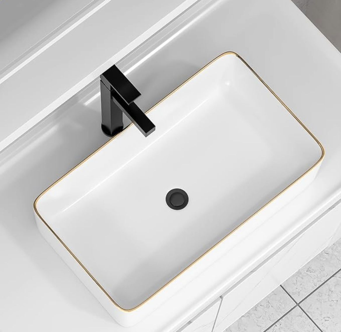 Brand new, still in original box, rectangular vessel sink featuring a contemporary European-inspired design. The gold rim adds a touch of elegance and unique aesthetic appeal. 24" x 14" x 4.5" White large vessel sink with smooth, non-porous surface with a baked-on glaze for added durability and a high-gloss finish. Rectangle vessel sink above counter installation. Fit 1-3/4" Center Drain Hole. Rectangle bathroom vessel sink dimension: 24" W x 14" D x 4.5" H. Not Included: Drain Assembly/ Waste Pedestal Faucet/ Tap Features Crafted from high-quality ceramic, this white vessel sink boasts a smooth, non-porous surface with a baked-on glaze for enhanced durability and a high-gloss finish that resists stains and scratches.