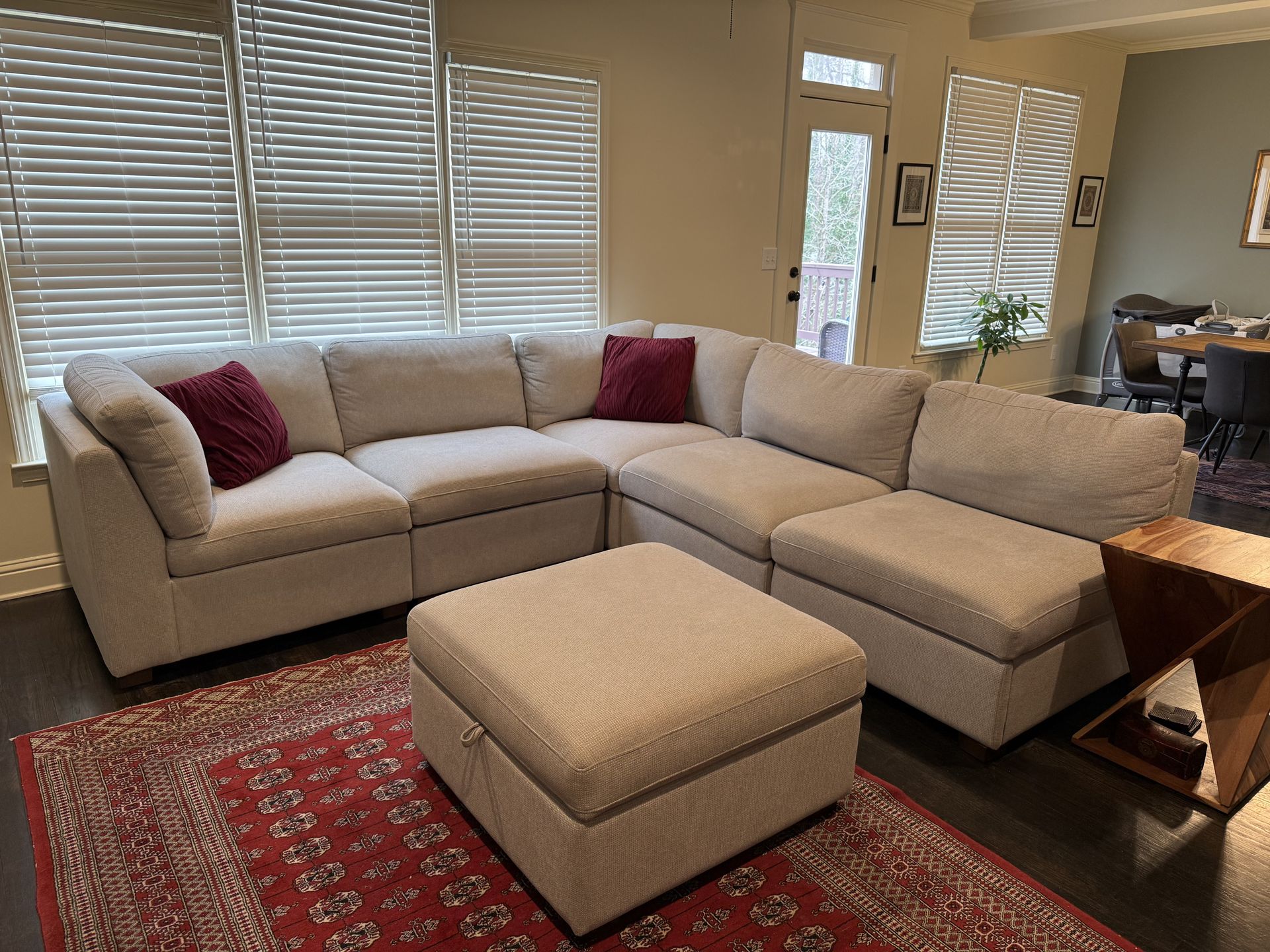 $850 OBO Located in east atlanta, original price $1899. Less than 2 years old. The Thomasville Rockford 6 piece fabric modular sectional is a versatile, gray polyester sofa featuring two power reclining footrests, a storage ottoman, and flexible reconfigurable seating. It includes pocket coil seat cushions for comfort and solid wood legs in a walnut finish. Components: 1 armless unit, 2 corner/wedge units, 2 armless units with power footrests, and 1 storage ottoman. Functionality: power buttons on the side allow for easy reclining of the footrests. Storage & convenience: the ottoman included lift top storage compartment. Design: modern, modular design with zippered removable back cushions.