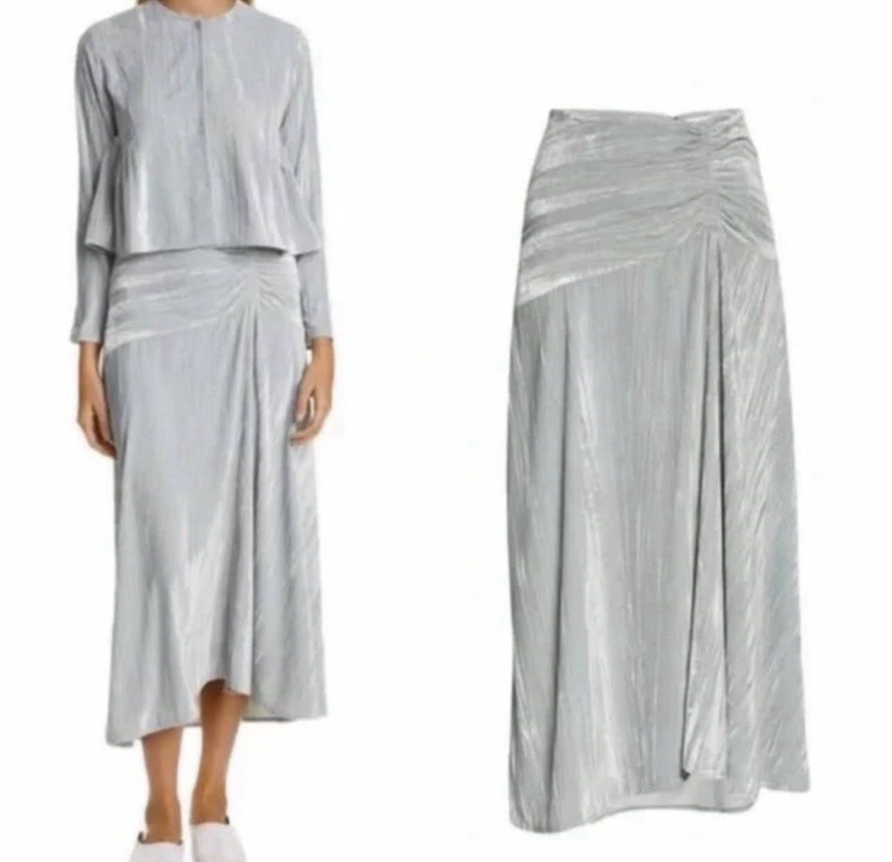 Vince Ruched Velvet Paneled Skirt Pale Sea Glass Size 8 New with tag ruched detail softly structures this dreamy skirt, tailored in textured, sea-glass-shaded velvet for a look of airy elegance. Fabric: Lightweight, non-stretch textured velvet A bias-cut Vince skirt, crafted from crinkly, shimmery velvet that's reliably eye-catching. A softly ruched panel adds extra definition to the waist. Hidden back-zip closure Unlined 100% polyester Dry clean or machine wash Partial Nordstrom outlet tag Designer, velvet, midi, comfort, dress up or down, fall, winter, flattering fit Vince Ruched Velvet Paneled Skirt Retail $325 Paid $130 Asking $75 OBO