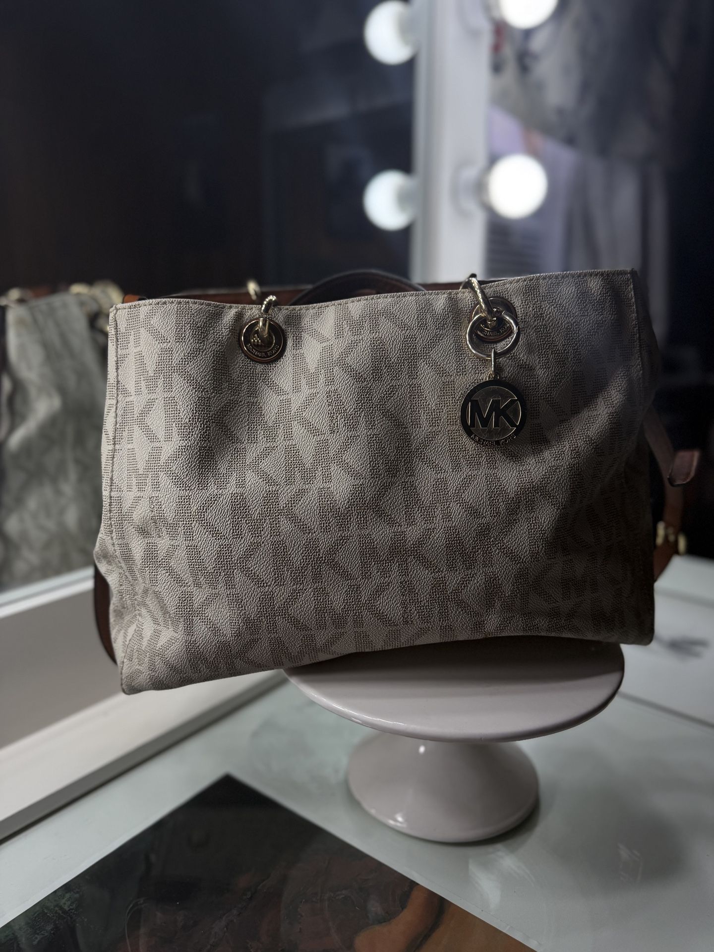 Michael Kors tote bag in a white or natural signature print canvas with brown leather accents and gold-tone hardware