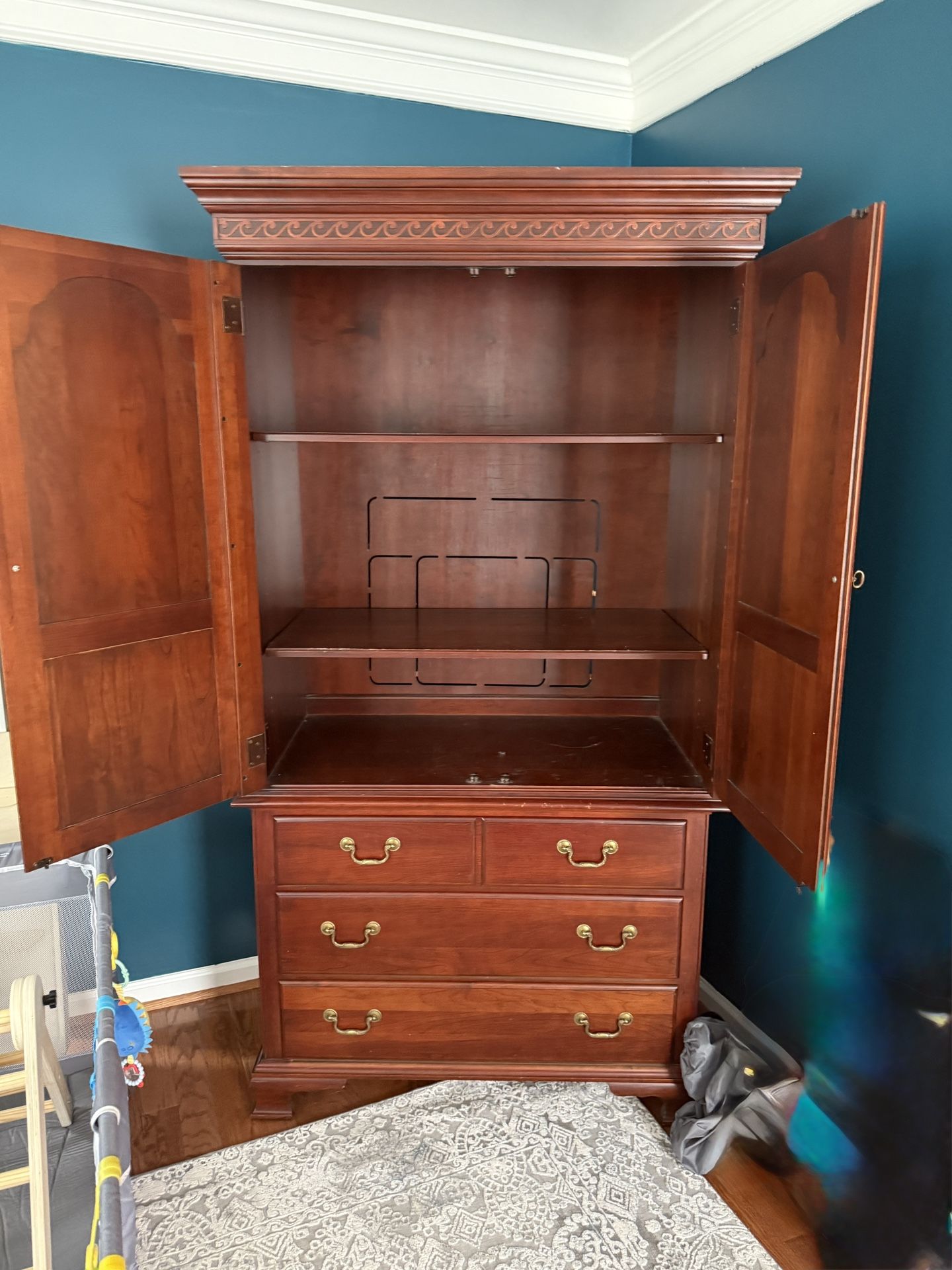 Two piece armoire. Top and bottom are separate pieces. Dimensions are 42”x79.5”x22.5”. Can help with pick up. $100 OBO