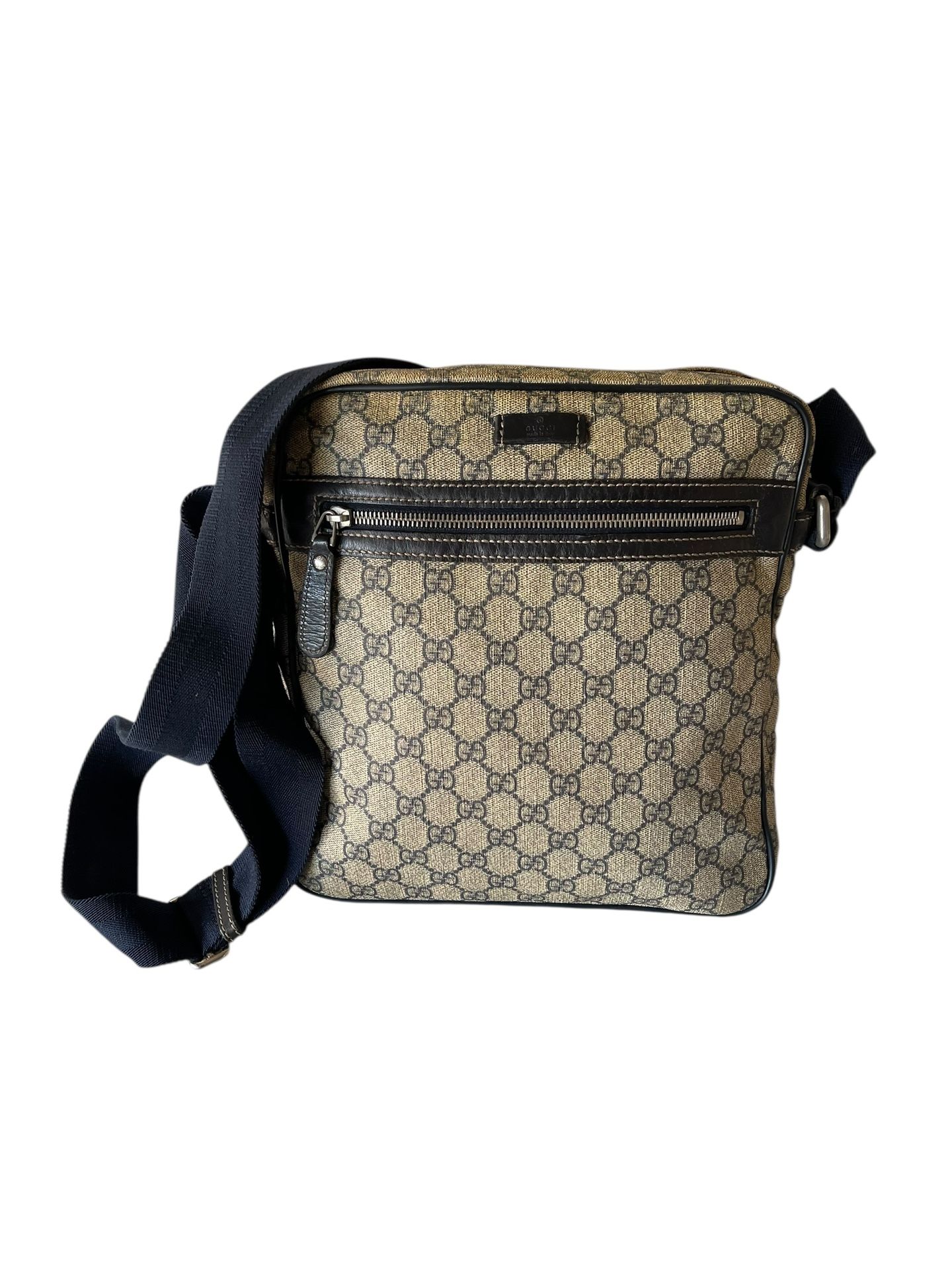 GUCCI GG SUPREME MESSENGER BAG Features: Beige/brown GG supreme coated canvas exterior; chocolate brown leather trim; front zip pocket; adjustable brown web shoulder strap; gold tone hardware; top zip closure to main compartment; brown textile lined interior with 1 x slip pocket. Origin: Made in Italy. Measurements: 26 cm (length) x 27 cm (height) x 6 cm (width) x 31 - 66 cm (shoulder strap drop). Condition: Great condition. The canvas exterior is in great condition with areas of darkening, mainly to the top, and faint wear otherwise. The leather trim is in great condition with light rubbing. The shoulder strap is in great condition with light wear and light creasing. The hardware is in very good condition with light wear and heavy gold tone loss throughout. The interior is in great condition with light wear and light rubbing. Comes