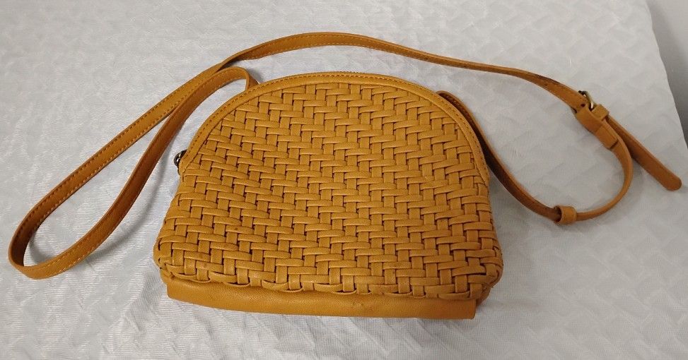 The Anthropologie Woven Over the Shoulder Strapped HandBag in Tan is a stylish and functional accessory for women. With a rectangular shape and brass hardware, this shoulder bag features a unique woven pattern and brown shoulder strap. The interior includes inner pockets for organization, making it a practical choice for everyday use. The tan exterior and brown lining add a touch of elegance to the design, making it a versatile option for various outfits and occasions. Made in China, this Anthropologie handbag combines fashion and functionality for the modern woman. Small scratches on sides and bottom of handbag. Otherwise, a great looking bag.