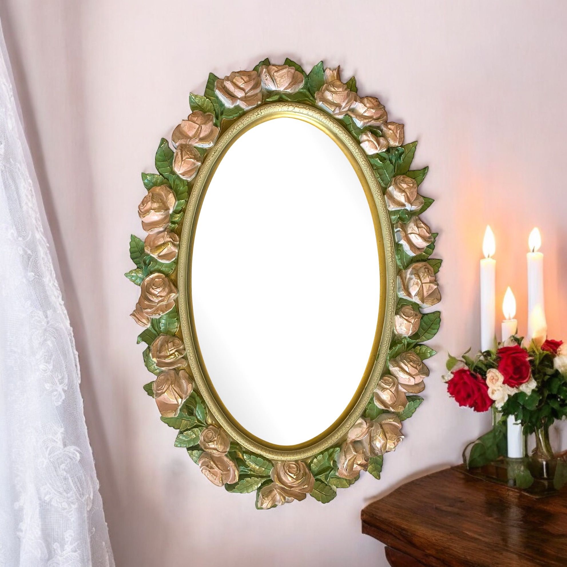 Vintage Oval Wall Mirror by Home Interiors Roses Trim Made in USA, 18ʺW × 1ʺD × 27ʺH, with blush and gold roses, very beautiful, the picture doesn’t do it justice, very lovely cottage core, , buyer must pick up