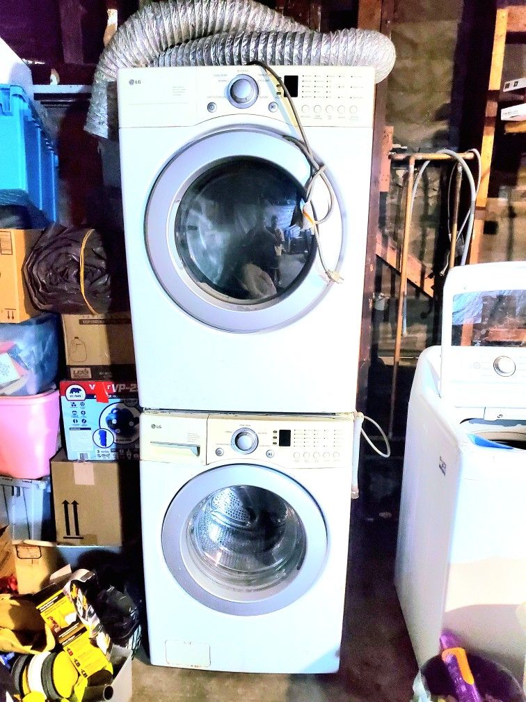 LG-DLG2526W WASHER & DRYER DIMENSIONS 27"x30"x39" ITEMS WORK GREAT. HAVE THEM AS EXTRAS NOW SINCE I GOT NEWER ONES GIFTED TO ME. MINOR COSMETIC ISSUES BUT DOES NOT HINDER FUNCTIONALITY. THEY ARE STACKABLE BUT NEED HARDWARE FOR THEM. THERE IS HARDWARE ON THEM NOW TO STACK BUT MIGHT NEED ADDITIONAL. ASKING $140 FOR BOTH