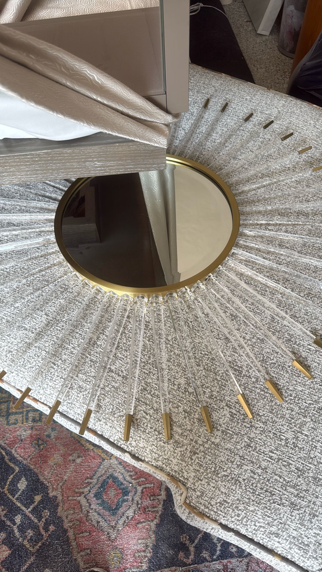 Round mirror 35” diameter gold satin metal frame accents lucite spires. Perfect condition