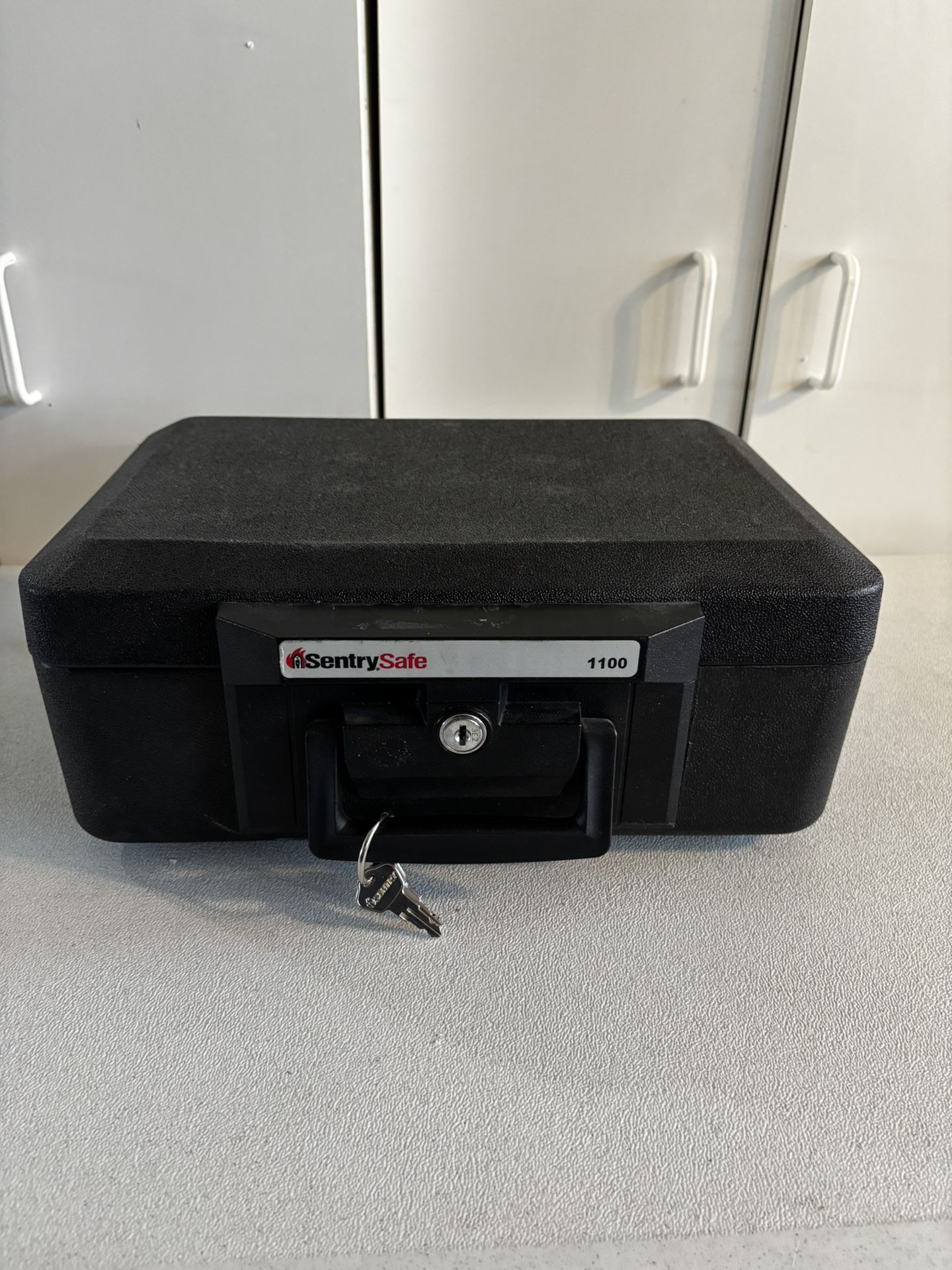Sentry 1100 safe is in excellent condition, showing minimal signs of wear. The locking mechanism functions smoothly, and both original keys are included. It's perfect for storing important documents, passports, cash, and small valuables, providing essential protection against fire hazards