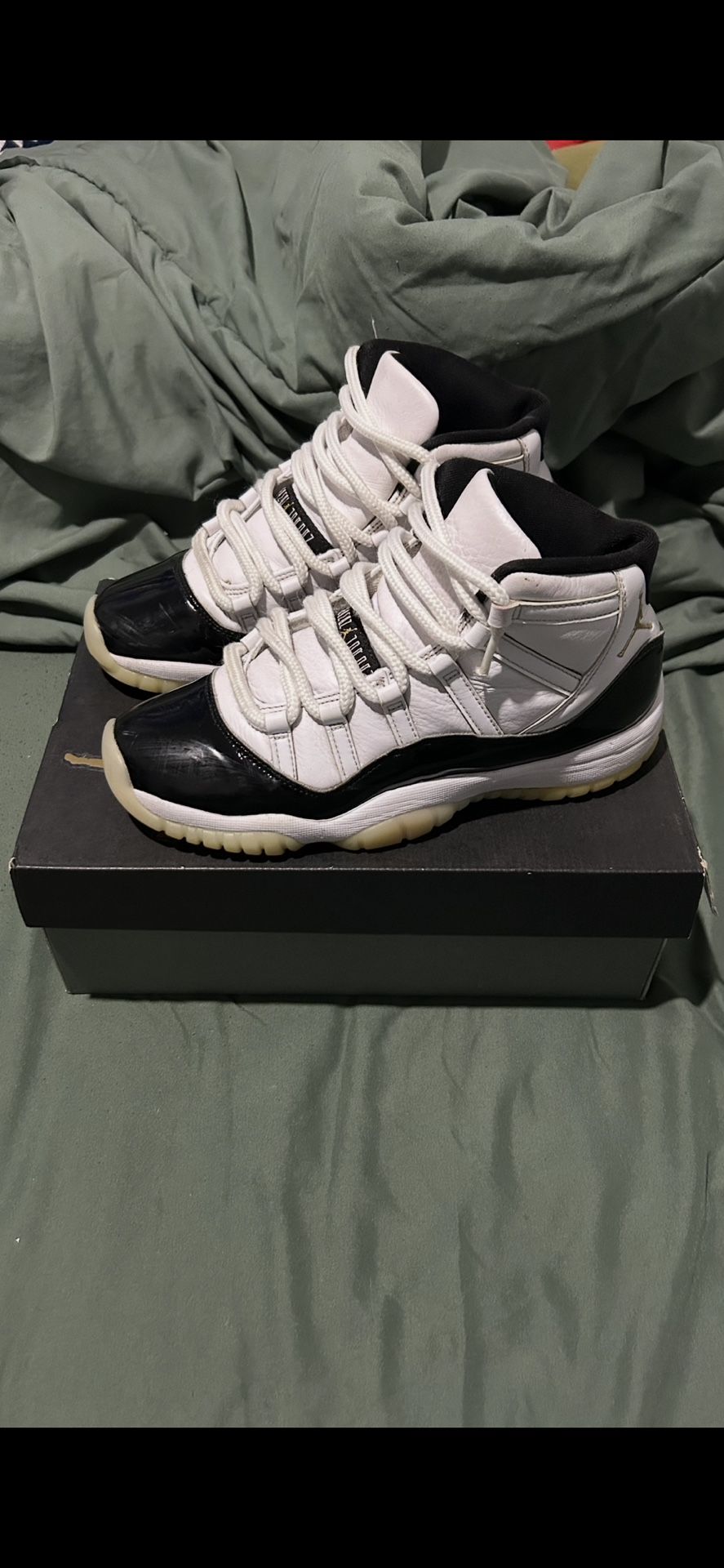 Pre-owned Air Jordan 11 Gratitude (Defining Moments) Grade School size 7Y. • 100% authentic • Includes original box • Used condition • Minor creasing from wear • Light outsole yellowing (normal for 11s) • No sole separation Clean classic black & white colorway with gold Jumpman detailing. Please review all photos carefully for exact condition. Ships fast and securely. Feel free to message with any questions.