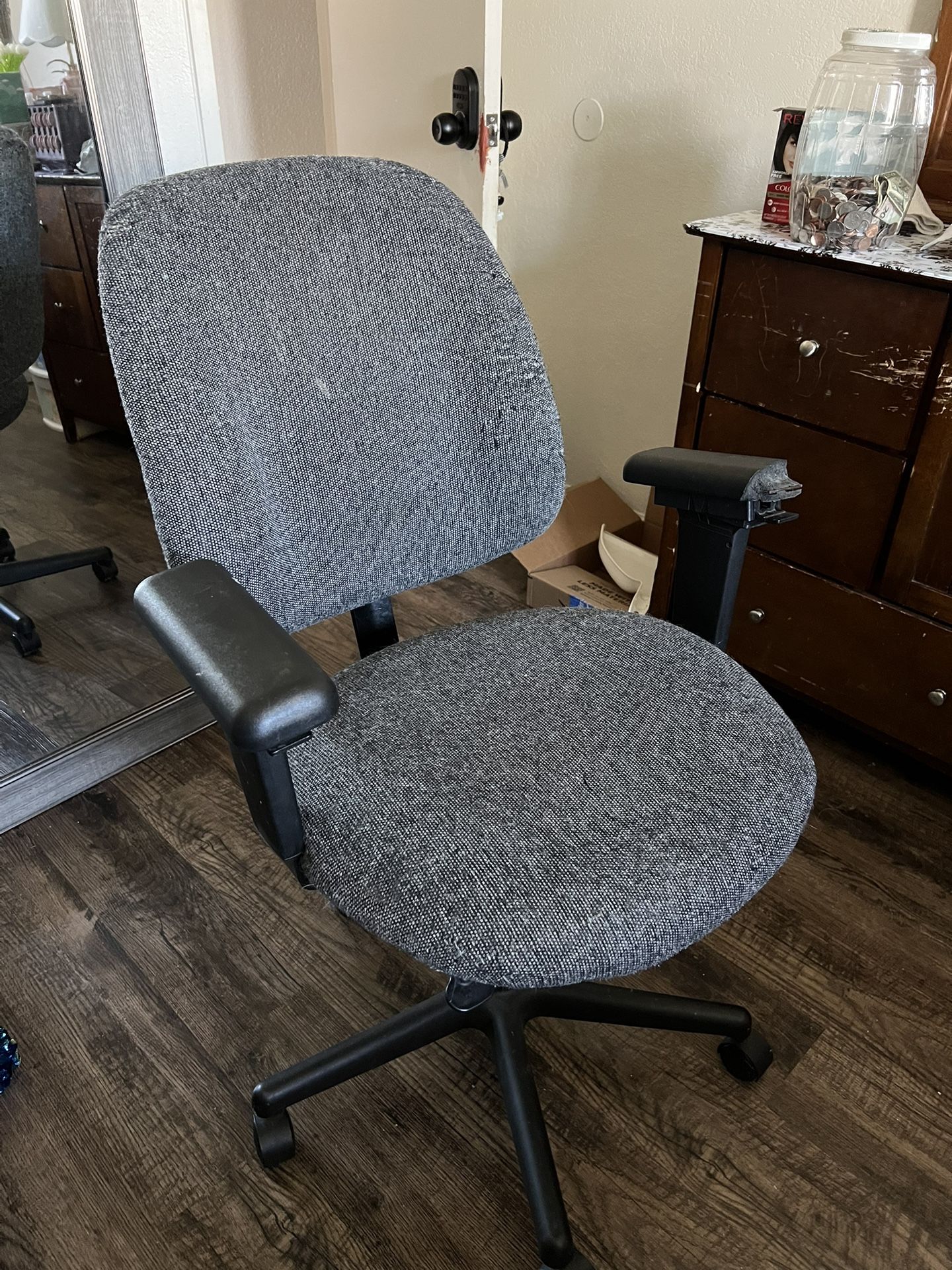 Grey office rolling chair! Arm rest foam tip Is damge but it still works