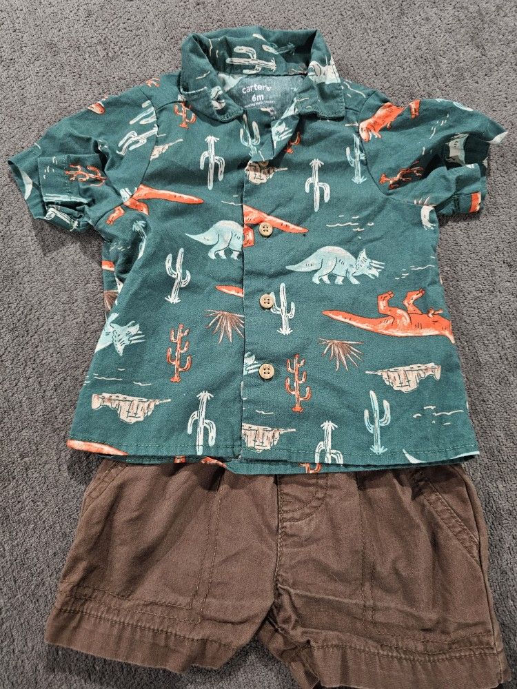 Dinosaur print shirt with brown shorts. Size 6 months. No rips no stains. Pick up only. Bullard and willow. Follow my page for other great deals.