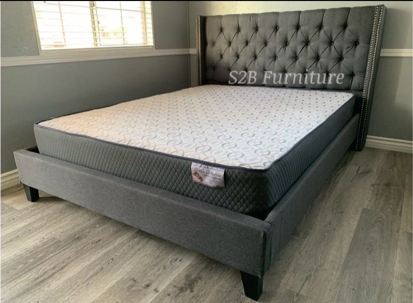 Queen Size Grey Tufted Bed W Orthopedic Mattress