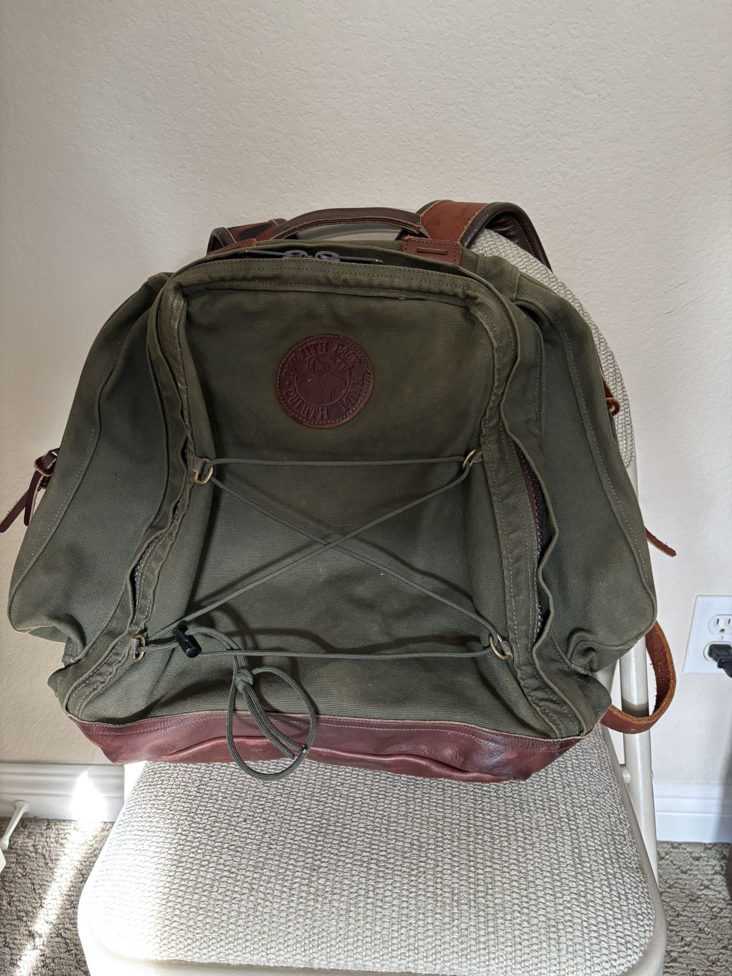 Vintage Duluth backpack. Quality leather and canvas. 18” x 18” x 8”. Expands generously to accommodate items. Great condition.