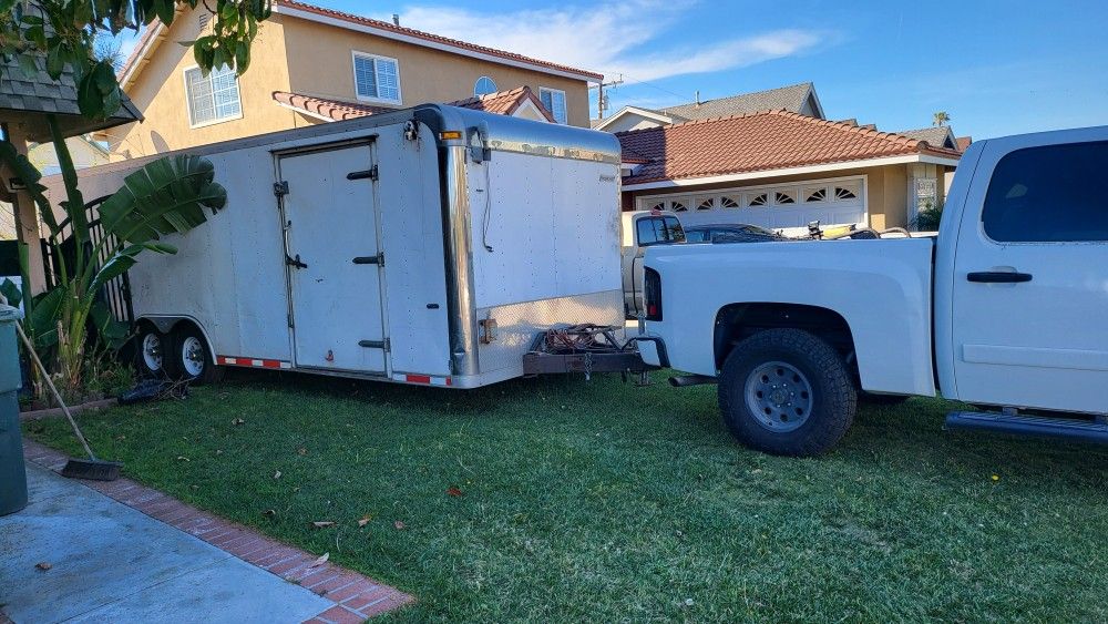 30 ft toy hauler. 26-ft box 30 ft total length. Rear door opens straight down. Cabinets up one side workbench at the far end. Cable winch. Forever registration. Paperwork in hand.
