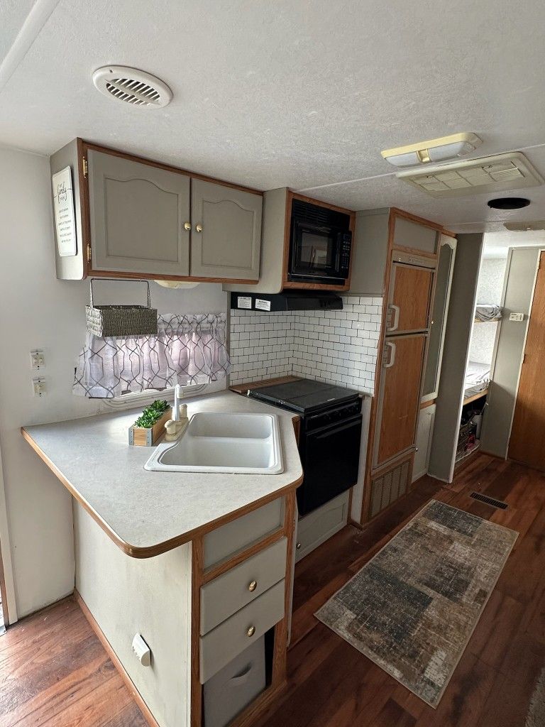New AC to DC inverter, 4 tires 2 years old, generator, trailer hitch with sway bars included, 29 feet long, new toilet put in. Sleeps 4 adults (master queen bed, pull out couch and dining table makes into a bed) and 3 children bunk beds comfortably. Please contact Don Stewart for more info. *Renovation on inside of trailer, new pictures posted!* $10,500 obo Trailer is for recreational use such as camping.