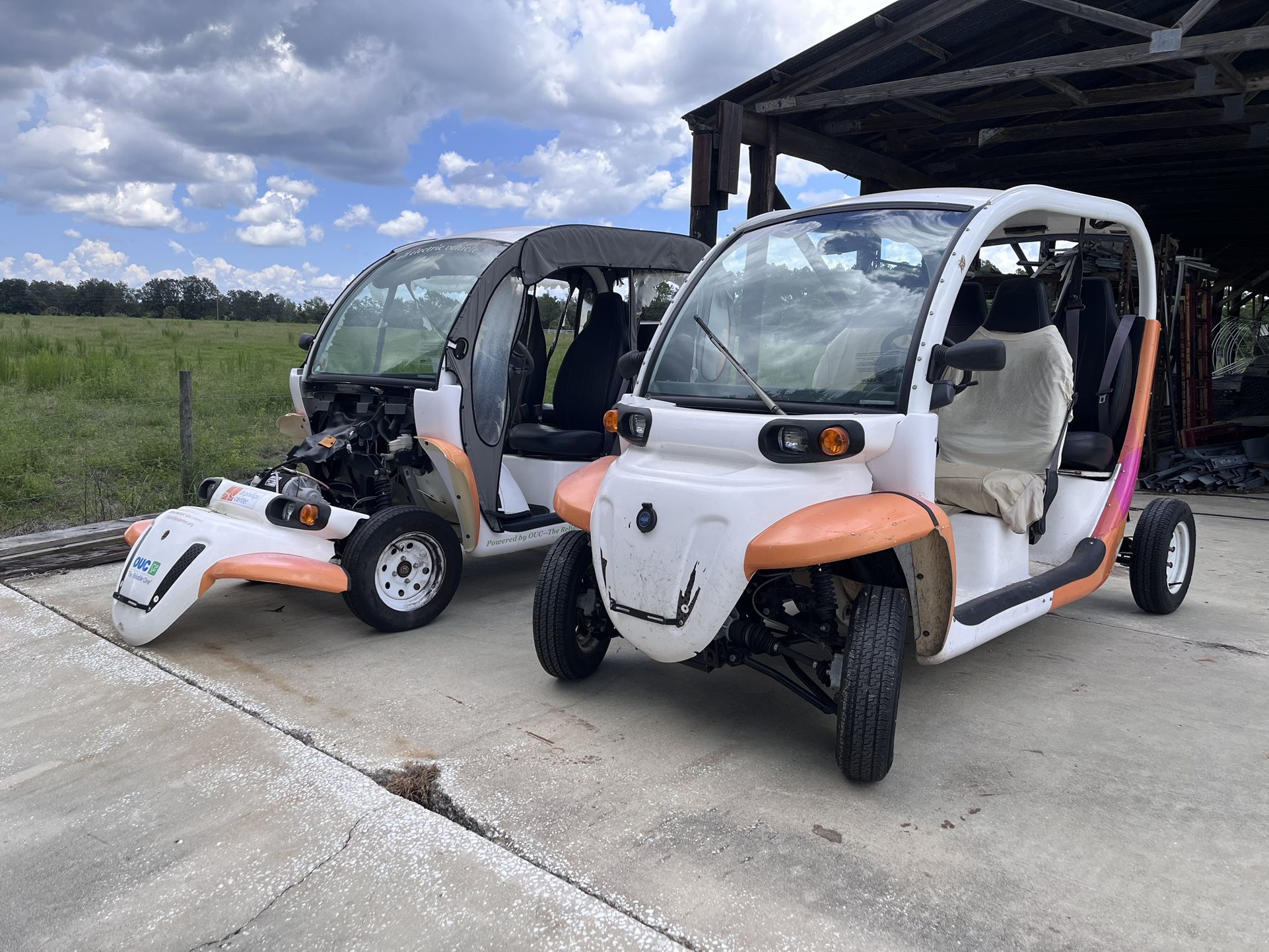 Four passenger electric cart can be made street legal. One good one running plus one for parts..  included in the price  good one has excellent tires headlights, turn signals horn, windshield wiper. Good brakes, Upholstry in both in excellent condition. The carts have internal automatic voltage regulators so charging the batteries simply requires plugging into any 110 outlet