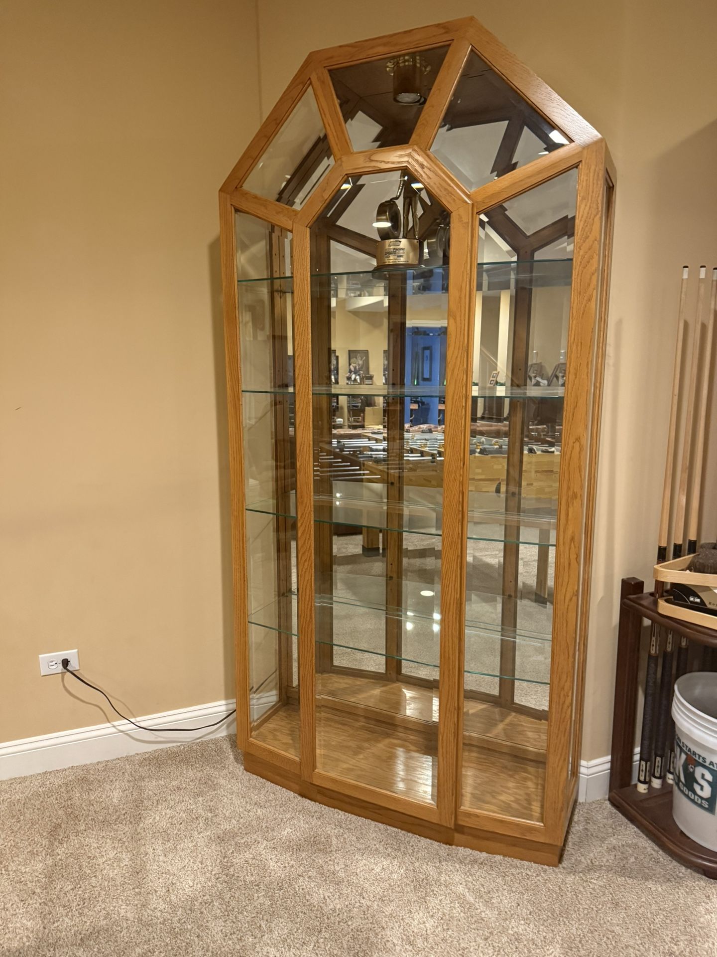 Beautiful oak curio cabinet with mirrored back and light Great way to display your precious items