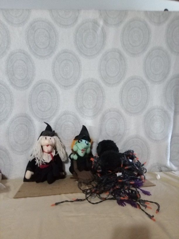 Spider With Halloween Lights Attached Green witch With Broom White Witch