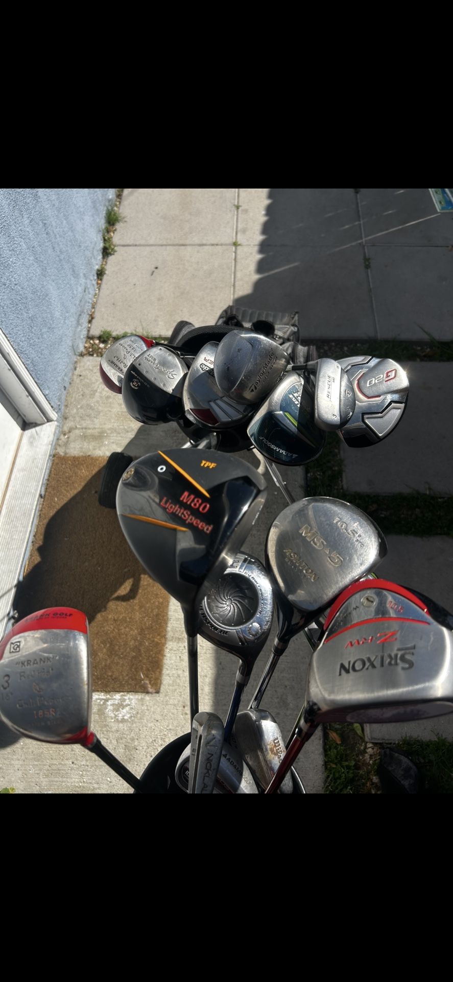 Mixed golf club set including Ping, TaylorMade, Adams, Srixon and more. Includes drivers, irons, putters and rolling golf bag. Great starter set or spare clubs.