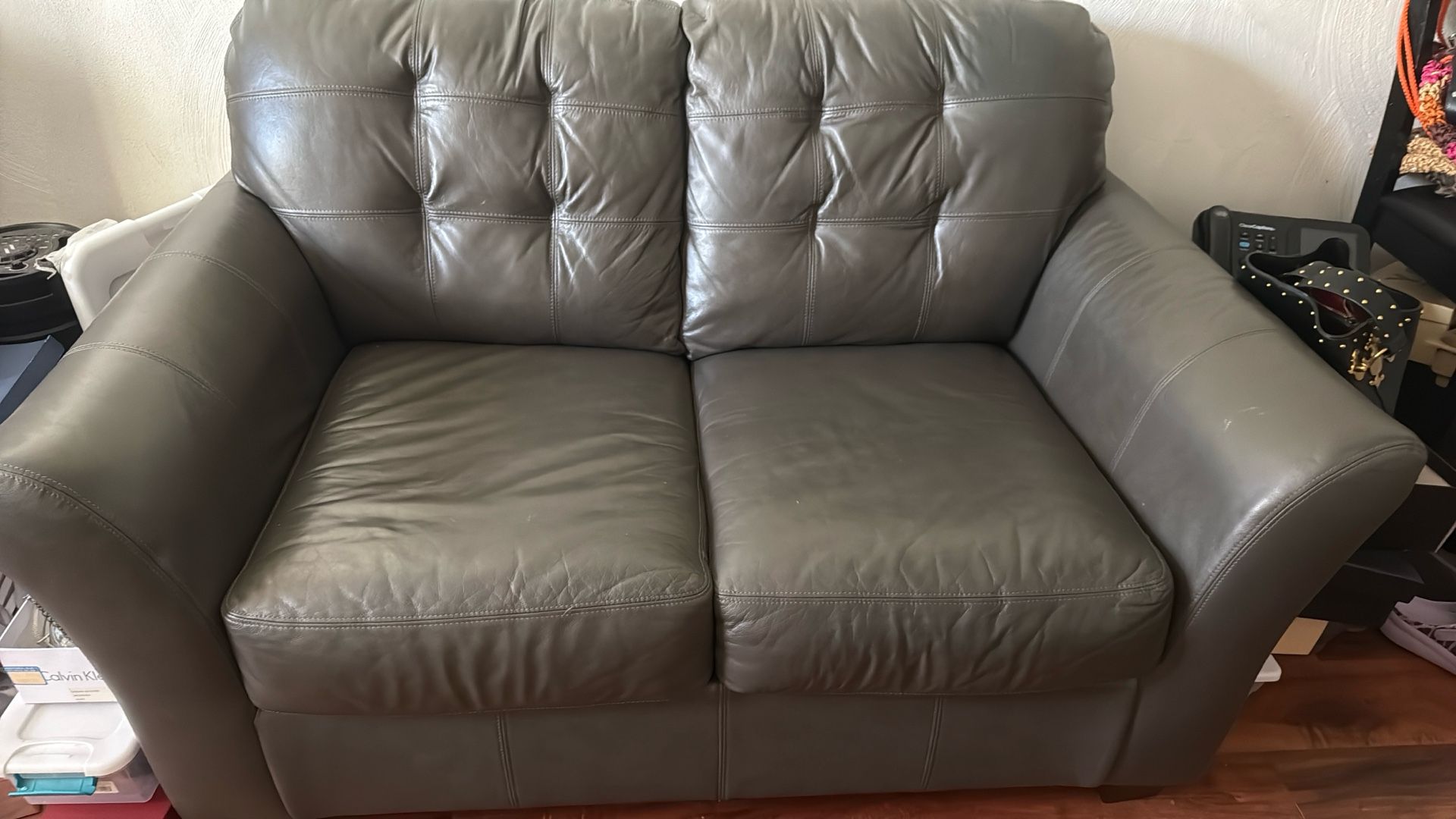 Loveseat is about 5 years old, no rips, no tears, it’s real leather .